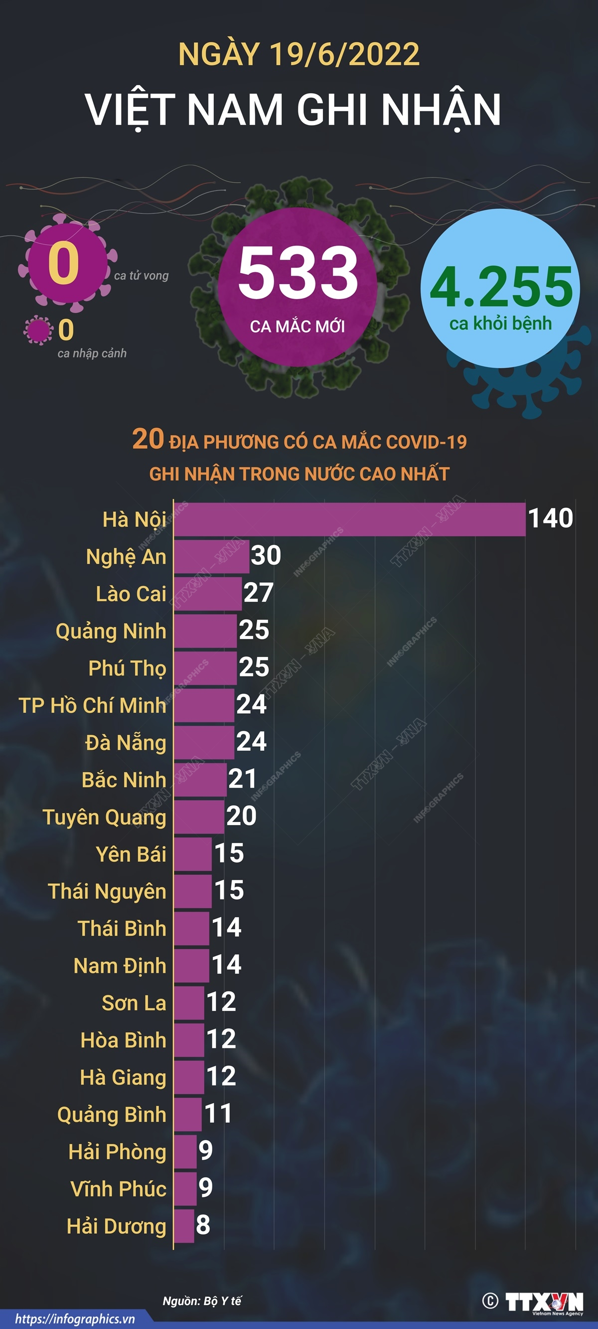 Theo Bộ Y tế, tính từ 16h ngày 18/6 đến 16h ngày 19/6/2022, Việt Nam ghi nhận 533 ca mắc mới COVID-19 tại 38 tỉnh, thành phố