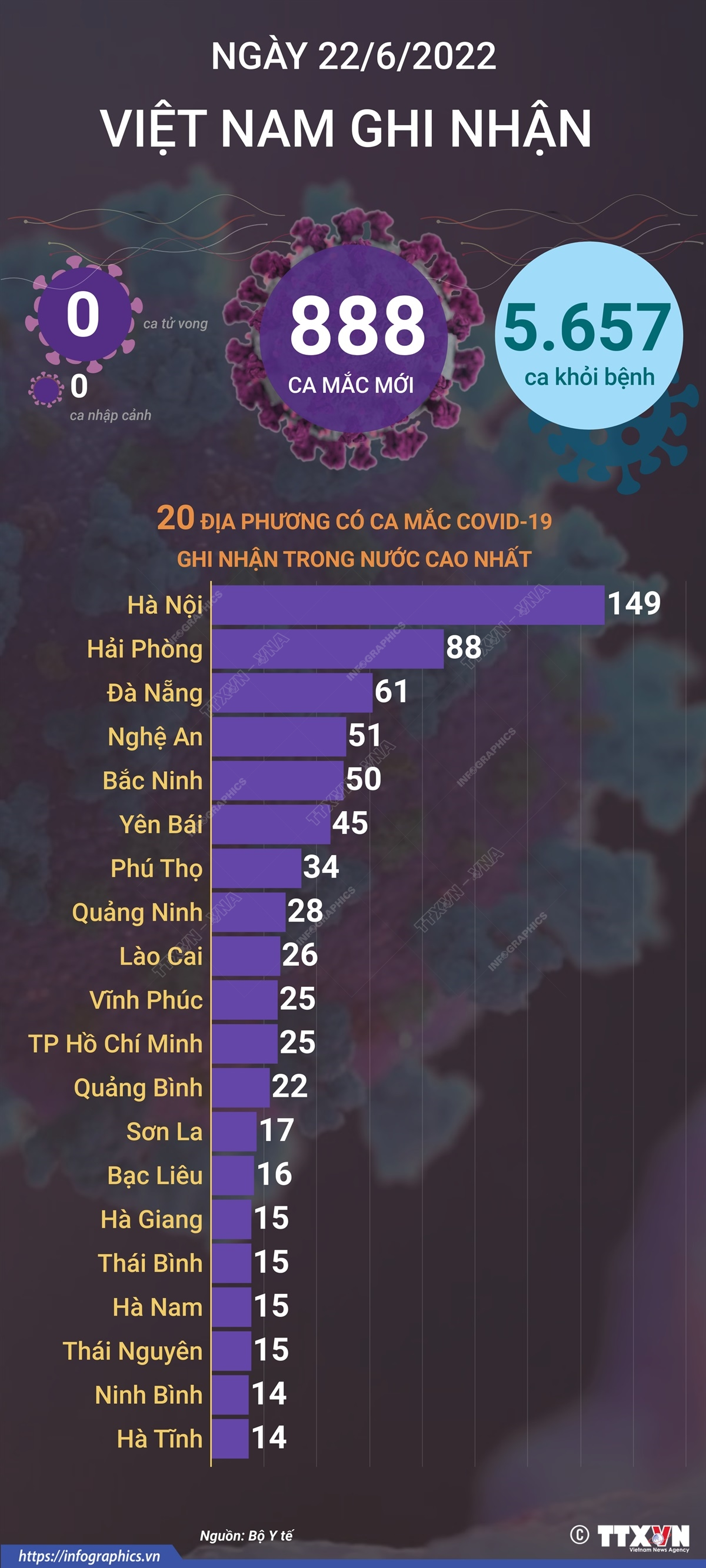 Theo Bộ Y tế, tính từ 16h ngày 21/6 đến 16h ngày 22/6/2022, Việt Nam ghi nhận 888 ca mắc mới COVID-19 tại 43 tỉnh, thành phố
