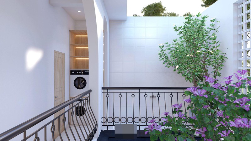 Vườn đã phát huy hiệu quả khi tạo ra không gian mát mẻ, xanh mướt. Thiết kế nhà hình chữ L giúp phòng nào cũng có ban công hướng ra vườn, hút gió trời, ánh sáng tự nhiên. Phần ban công chạy dài, liên kết các phòng với nhau.