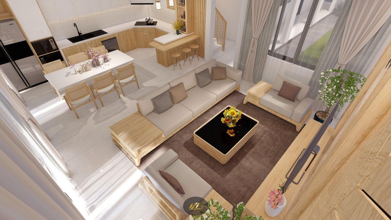 Bếp và phòng khách liên thông, để mọi thành viên dễ dàng kết nối với nhau khi ở không gian sinh hoạt chung. Màu sắc chủ đạo của nhà là gỗ vàng và trắng. Tone màu tưởng dễ kết hợp nhưng nếu không cẩn thận sẽ khiến nhà thiếu thẩm mỹ. "Ngôi nhà có sự đối lưu gió, luân chuyển ánh sáng tốt sẽ mở ra cuộc sống trong lành, tích cực", anh Tuấn Anh nói.