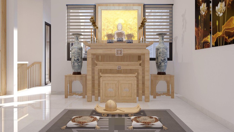 Gia đình Á Đông không thể thiếu ban thờ. Đây là nét đẹp truyền thống trong văn hóa của nước ta. Nơi thờ tự cùng trên một mặt bằng với phòng đa năng. Phòng đa chức năng tích hợp cả nơi nghỉ ngơi, thư giãn, đọc sách, học đàn...