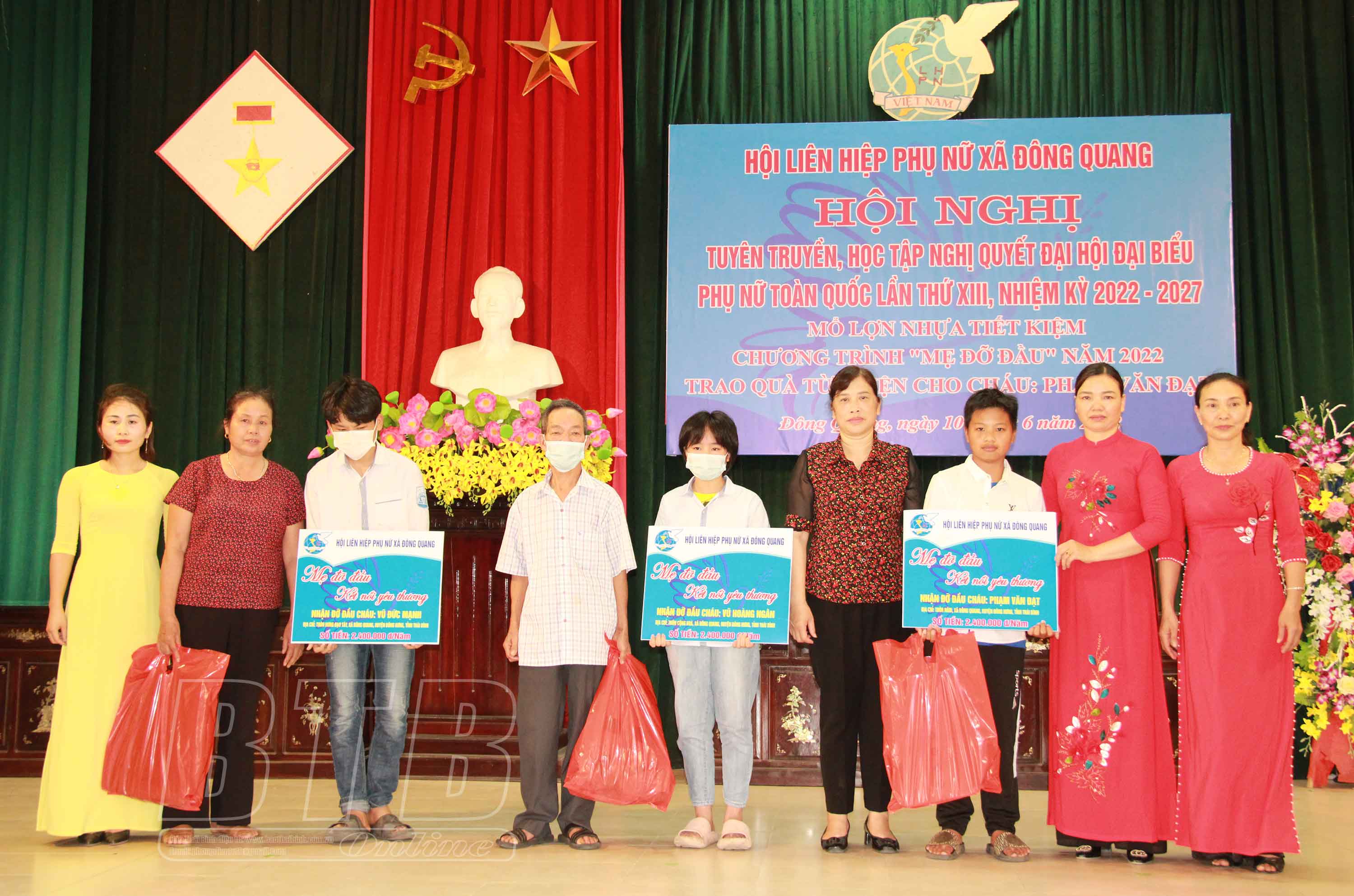 Huyện Đông Hưng hiện có khoảng 500 trẻ mồ côi, có hoàn cảnh đặc biệt khó khăn cần sự giúp đỡ của cộng đồng. Thông qua chương trình “Mẹ đỡ đầu”, với nguồn kinh phí từ việc trích quỹ hội, thu gom phế liệu bán lấy tiền, nuôi lợn nhựa tiết kiệm, kêu gọi các tổ chức, cá nhân, doanh nghiệp, nhà hảo tâm chung tay góp sức, đến nay các cấp hội LHPN trên địa bàn huyện Đông Hưng đã đỡ đầu 33 trẻ mồ côi, tổng số tiền trao năm thứ nhất gần 53 triệu đồng.