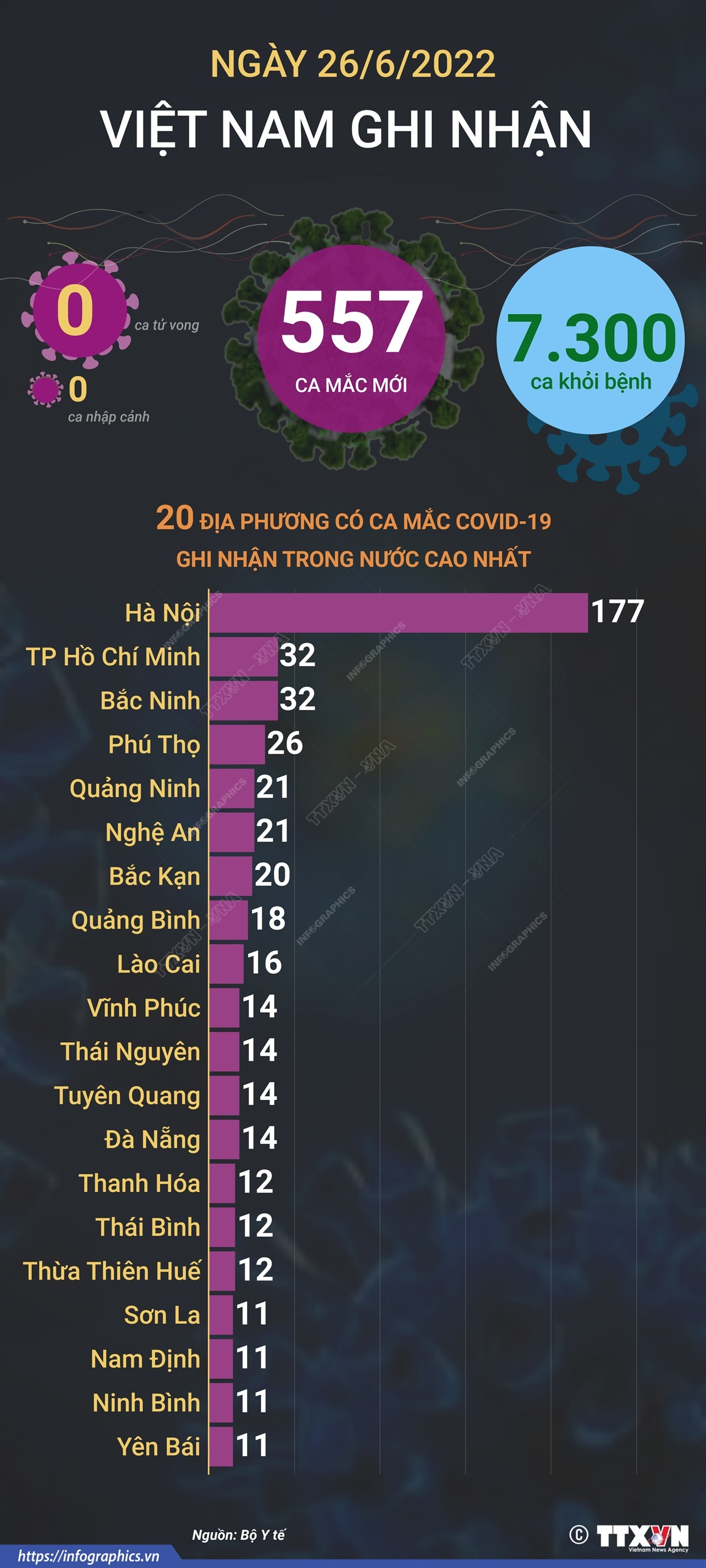 Theo Bộ Y tế, tính từ 16h ngày 25/6 đến 16h ngày 26/6/2022, Việt Nam ghi nhận 557 ca mắc mới COVID-19 tại 32 tỉnh, thành phố