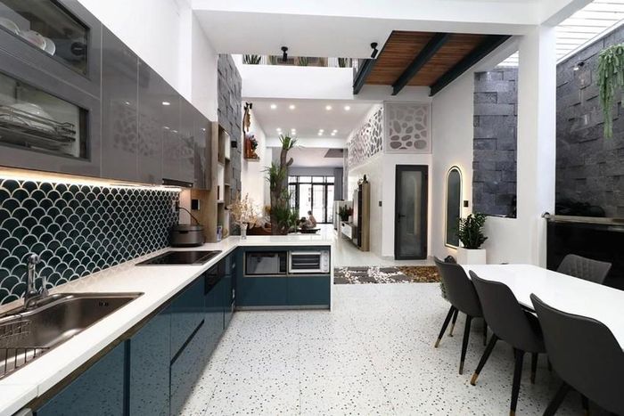 Phòng khách và bếp thiết kế sang trọng ở tầng trệt.