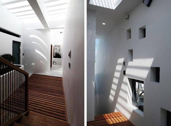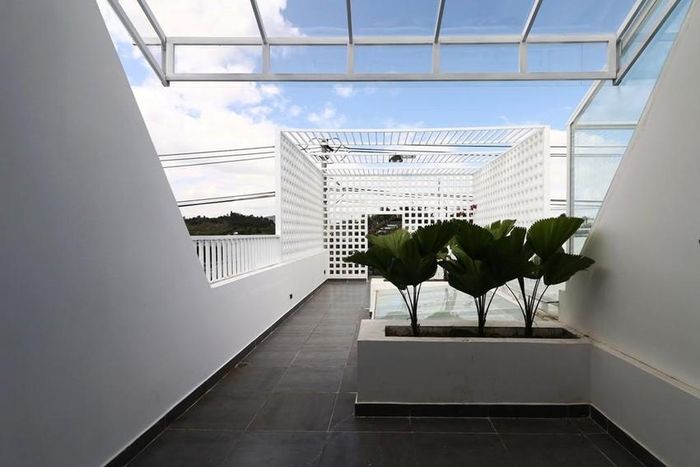 Tầng thượng là khoảng trống rộng với thiết kế ô gạch vuông thông gió. Màu trắng của những ô gạch làm nổi bật cả không gian tầng thượng.