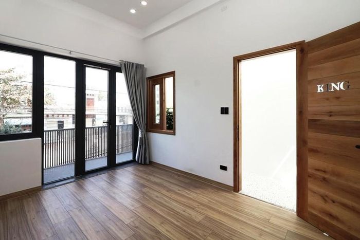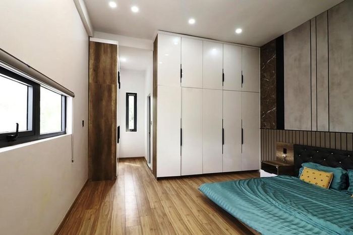 Phòng ngủ được lát sàn gỗ, hệ tủ áp tường đơn giản.