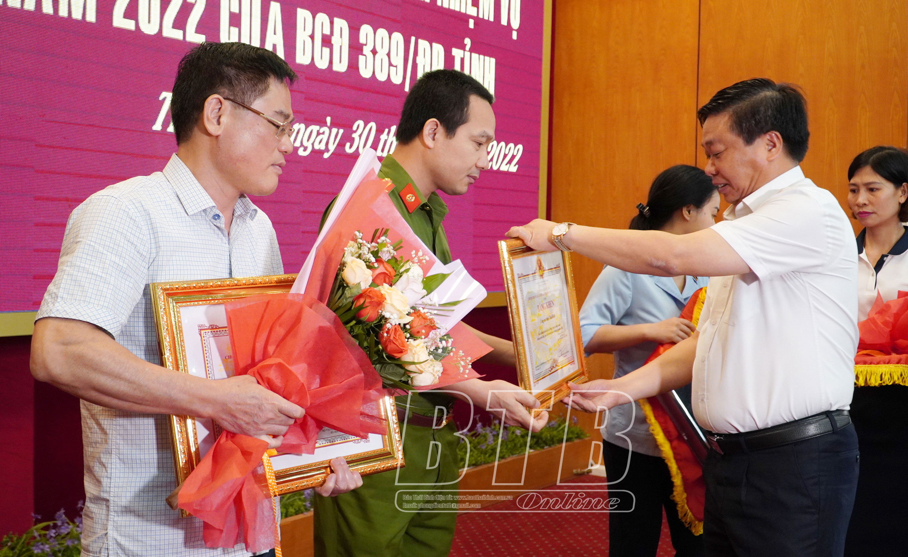 Đồng chí Phó Trưởng ban thường trực BCĐ 389/ĐP tỉnh trao bằng khen của BCĐ 389 quốc gia cho đồng chí Nguyễn Quang Hưng, Phó Chủ tịch thường trực UBND tỉnh, Trưởng BCĐ 389/ĐP tỉnh.