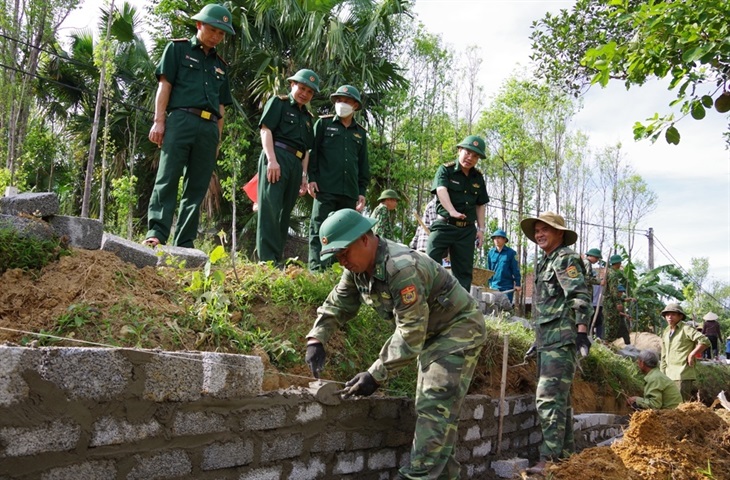 Cán bộ, chiến sĩ BĐBP Hà Tĩnh giúp nhân dân thôn 3, xã Hương Liên làm đường giao thông nông thôn. Ảnh: Thanh Giang