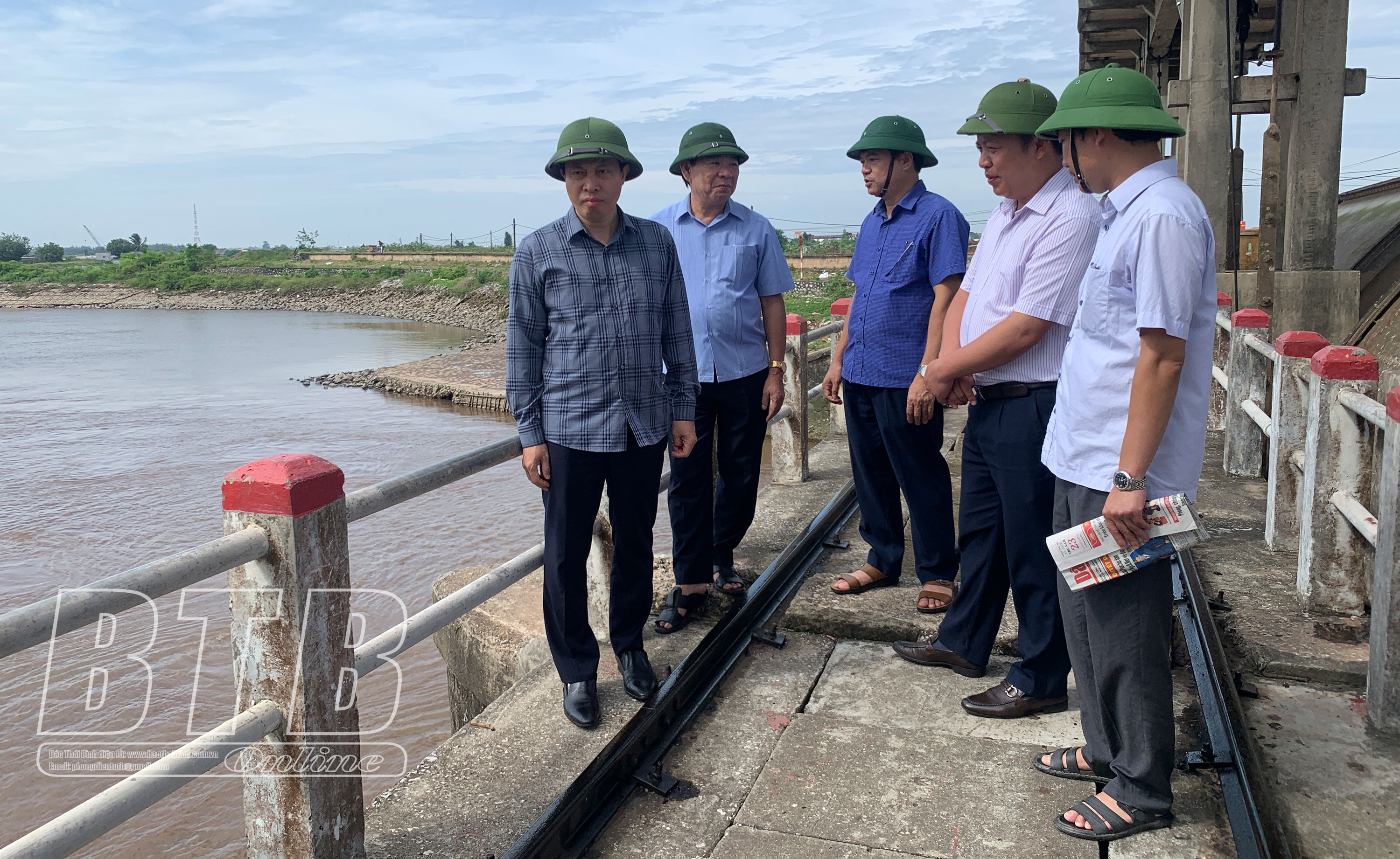 Kiểm tra công tác tiêu nước tại cống Lân (Tiền Hải), đồng chí Phó Chủ tịch UBND tỉnh, Phó Trưởng ban thường trực Ban Chỉ huy PCTT-TKCN tỉnh đề nghị huyện Tiền Hải thực hiện nghiêm các công điện của Ban Chỉ huy PCTT-TKCN tỉnh; theo dõi chặt chẽ diễn biến của bão và mưa lũ, thông tin, cảnh báo kịp thời đến các xã, thị trấn và người dân biết để chủ động triển khai các biện pháp phòng, chống, ứng phó có hiệu quả, kiên quyết không để xảy ra thiệt hại do chủ quan; sẵn sàng các phương án chống ngập úng, bảo vệ vùng mạ, hoa màu và lúa mới cấy, vùng nuôi trồng thủy sản, các vũng trũng, thấp…