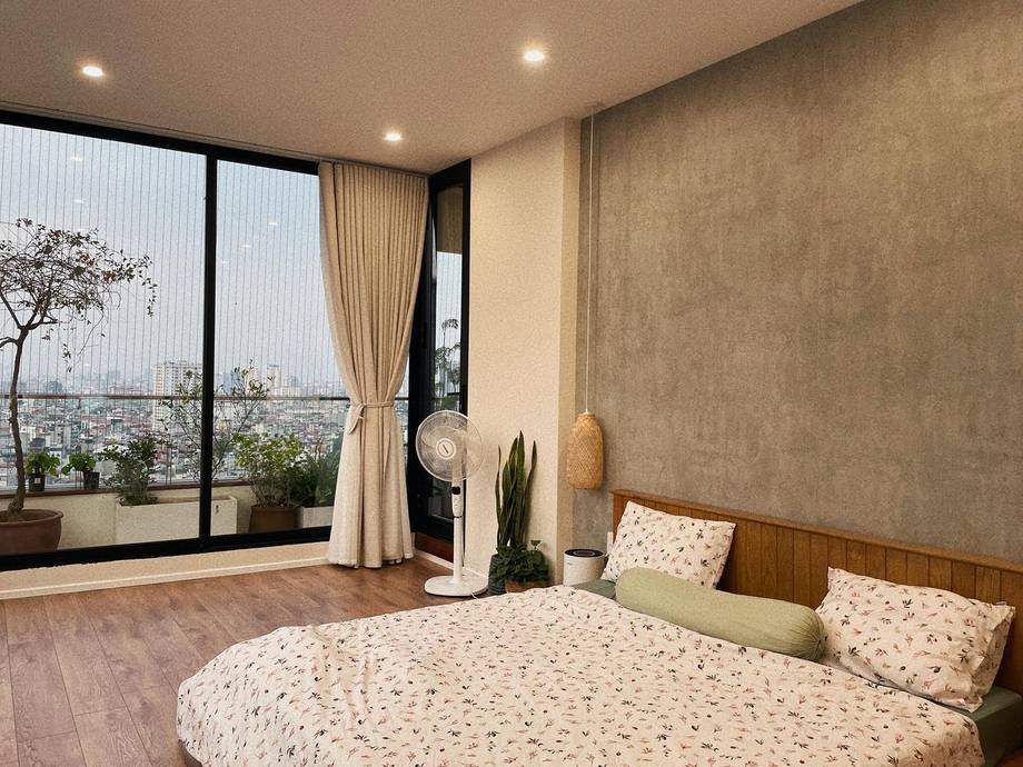 Phòng ngủ master bao quanh là kính, không gian ngập nắng gió. Trong phòng ngủ, gia chủ sử dụng giường kiểu Nhật dạng bệt với phần vai giường rộng, thấp và sát sàn, không có chân giường. Thiết kế giường này khiến căn phòng có cảm giác rộng rãi hơn.
