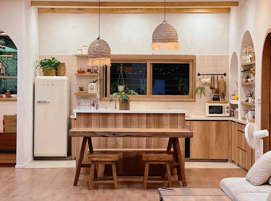 Chủ nhà đã lựa chọn những tông màu sáng cho bếp, đồng thời làm cửa sổ lớn để đón ánh sáng tự nhiên. Phong cách vintage được thể hiện rõ tại khu vực này khi nội thất thể hiện sự mộc mạc, tối giản.