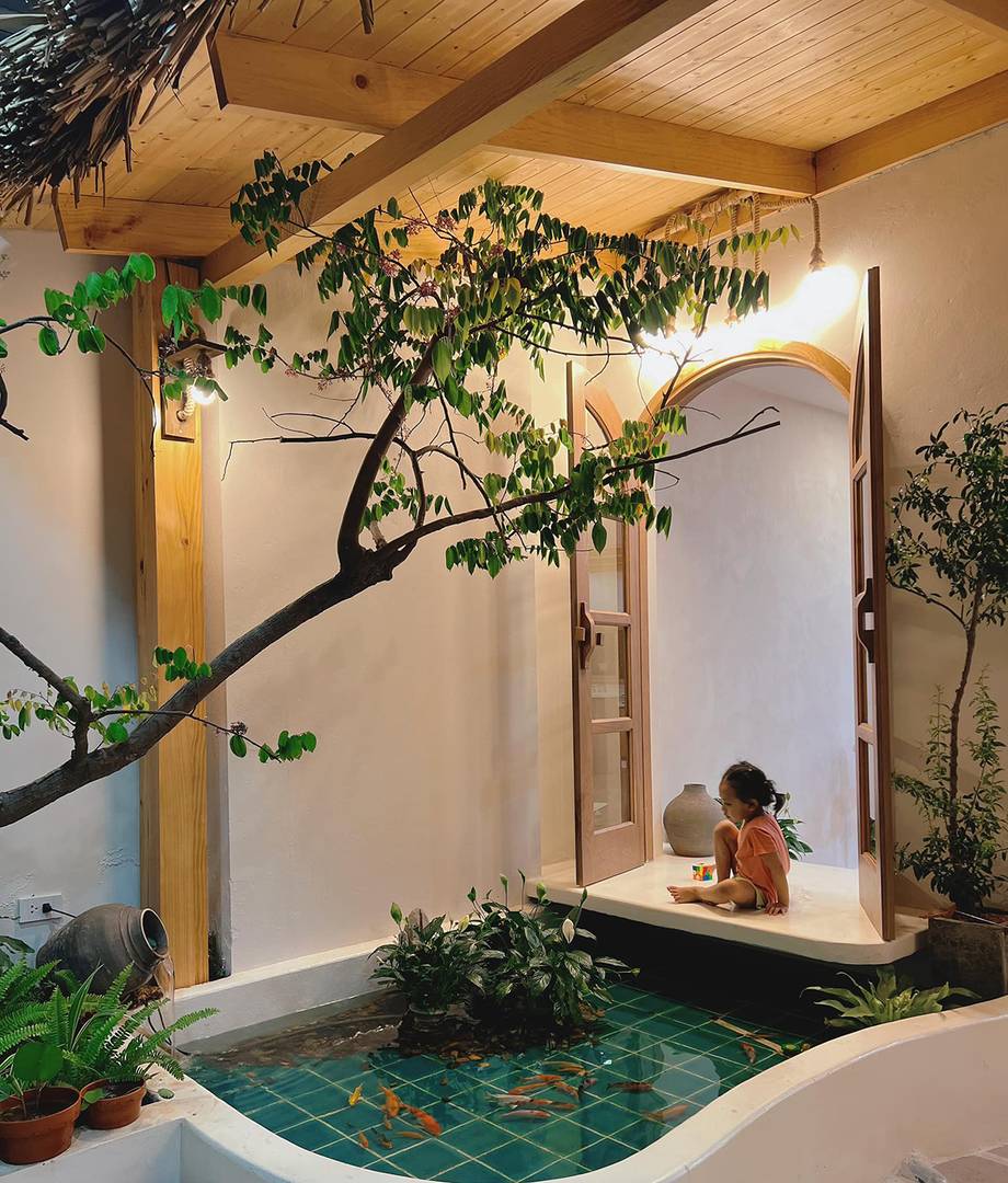 Phía ngoài vườn, chị Linh thiết kế bể cá nhỏ 5 m2, bên cạnh cây xanh là thác nước đổ. Đây là điểm nhấn thiết kế mang lại cảm giác mát mẻ và sinh động cho căn hộ.