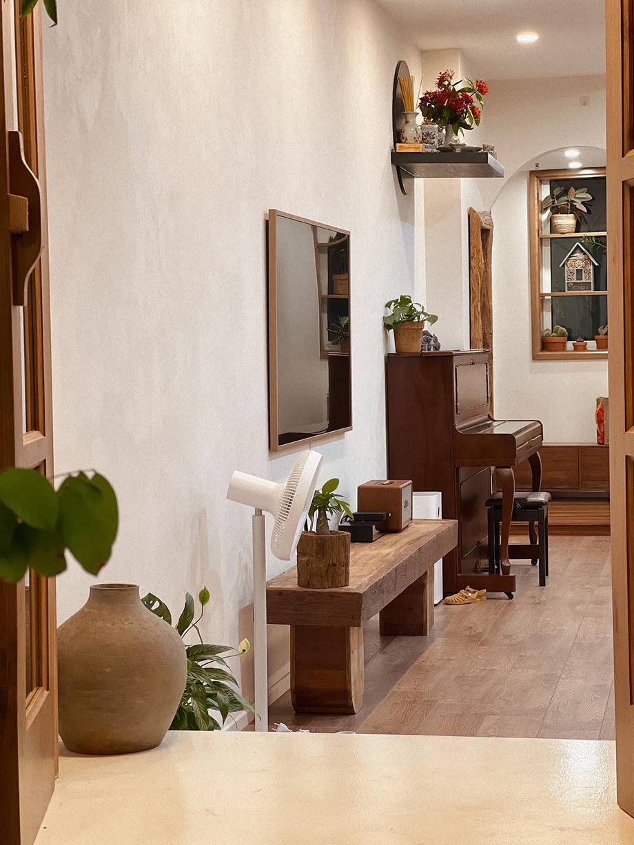 Mong muốn của gia chủ là có không gian sống mộc mạc, đem lại sự gần gũi và ấm cúng. Bà mẹ hai con đã cùng kiến trúc sư bàn thảo thiết kế và quyết định chọn phong cách vintage kết hợp wabi sabi cho căn hộ bốn thành viên.