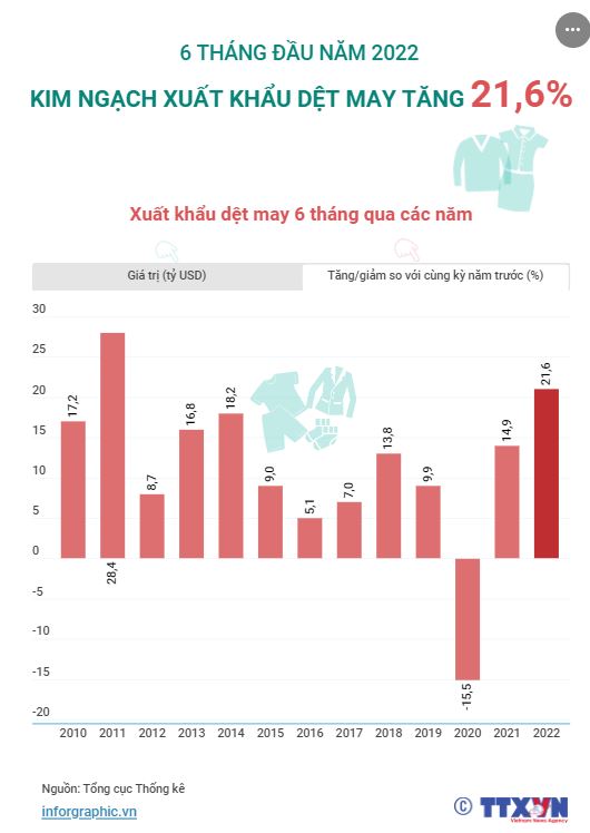 Theo báo cáo của Tổng cục Thống kê, trong 6 tháng đầu năm 2022, tổng kim ngạch xuất khẩu dệt may của Việt Nam đạt 18,65 tỷ USD, tăng 21,6% so với cùng kỳ năm 2021.