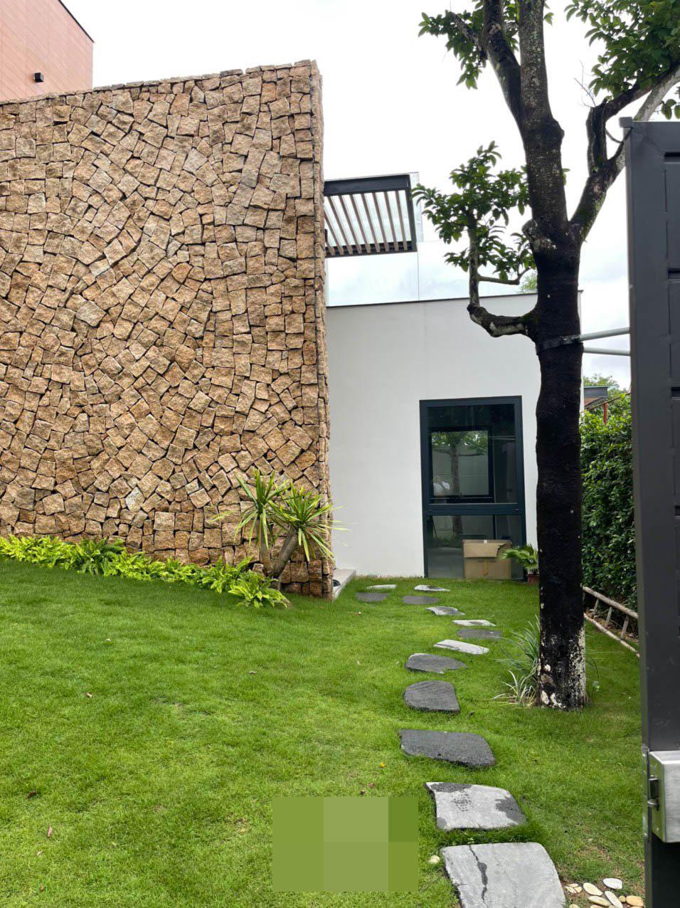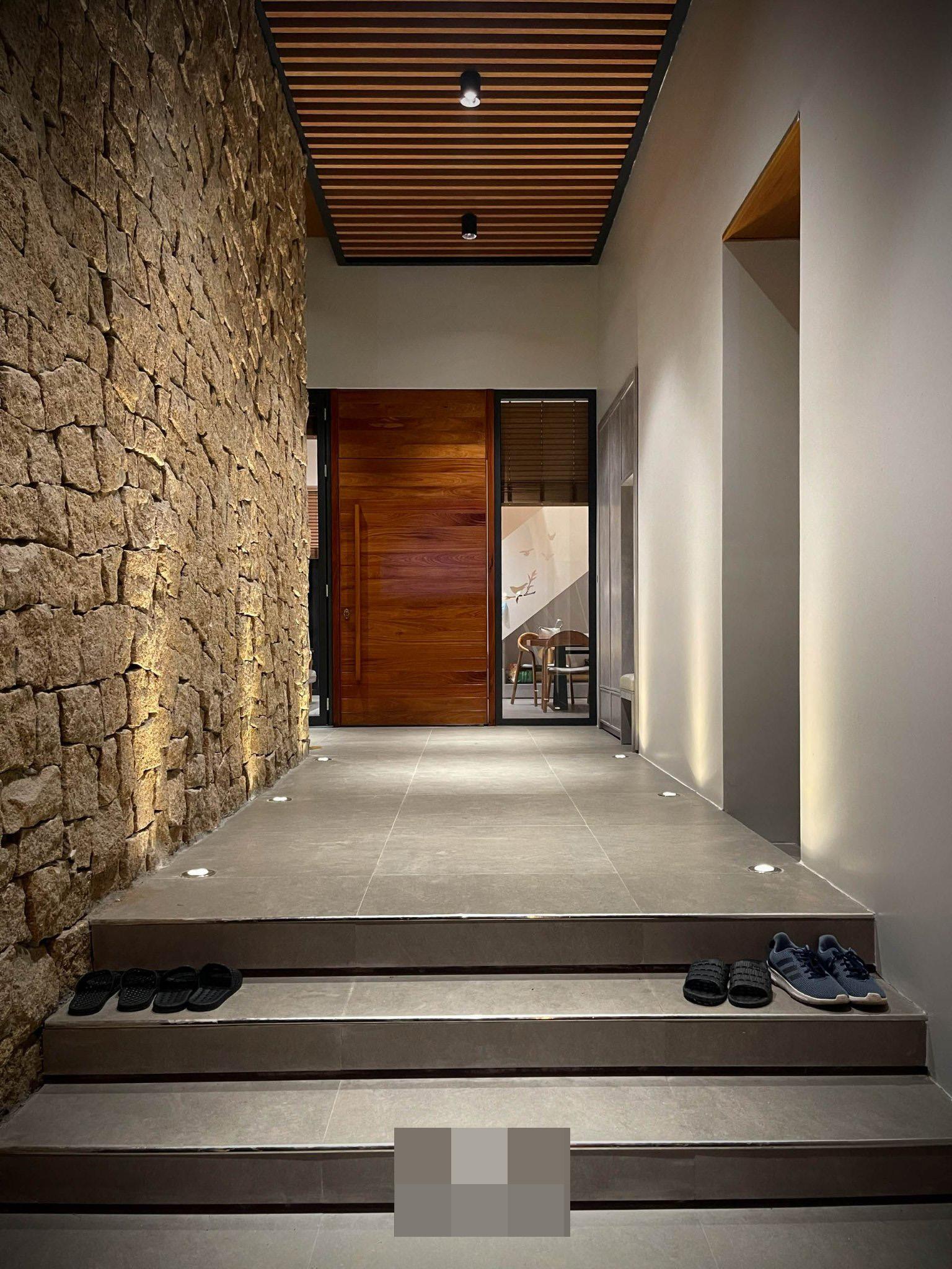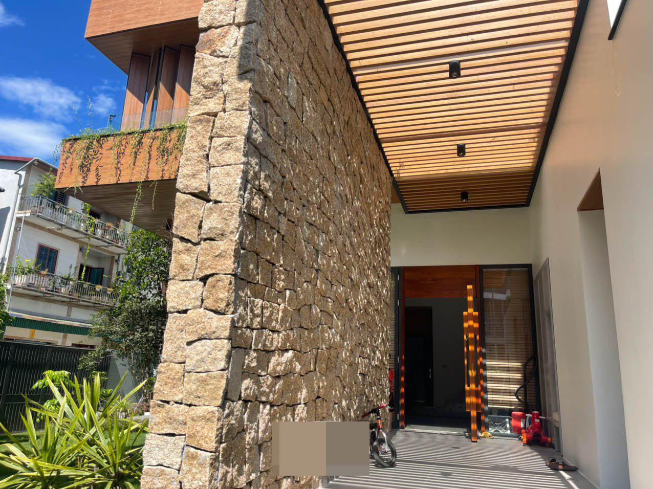 Khoảng đệm trước khi vào nhà với bức tường bằng đá mộc mạc, làm điểm nhấn trong khuôn viên vườn. Màu xanh đang dần bao bọc, phủ khắp nơi.