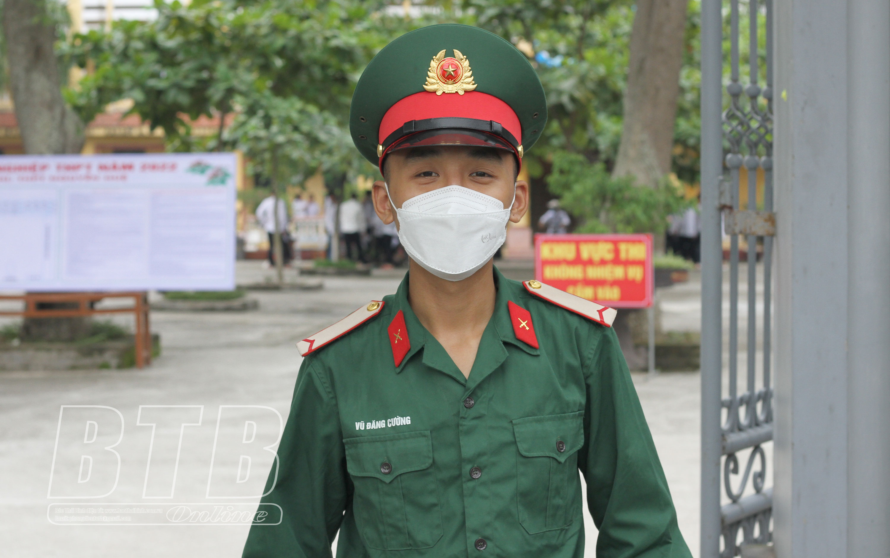 Cường chia sẻ: Em đang tham gia huấn luyện tại Tiểu đoàn Thiết giáp 47, Bộ Tư lệnh Thủ đô Hà Nội. Khi em báo cáo với thủ trưởng đơn vị về nguyện vọng được tham gia kỳ thi năm nay, em đã được đơn vị tạo điều kiện thuận lợi nhất để về tham gia kỳ thi tại quê hương. Khó khăn lớn nhất của em đó là bản thân vừa phải thực hiện huấn luyện tại đơn vị vừa phải bố trí thời gian học tập nên quá trình chuẩn bị thi cũng chưa được như mong muốn. Tuy nhiên, em đã cố gắng hết sức và tập trung cao độ để hoàn thành các bài thi. Em hy vọng mình sẽ đạt được kết quả tốt nhất.