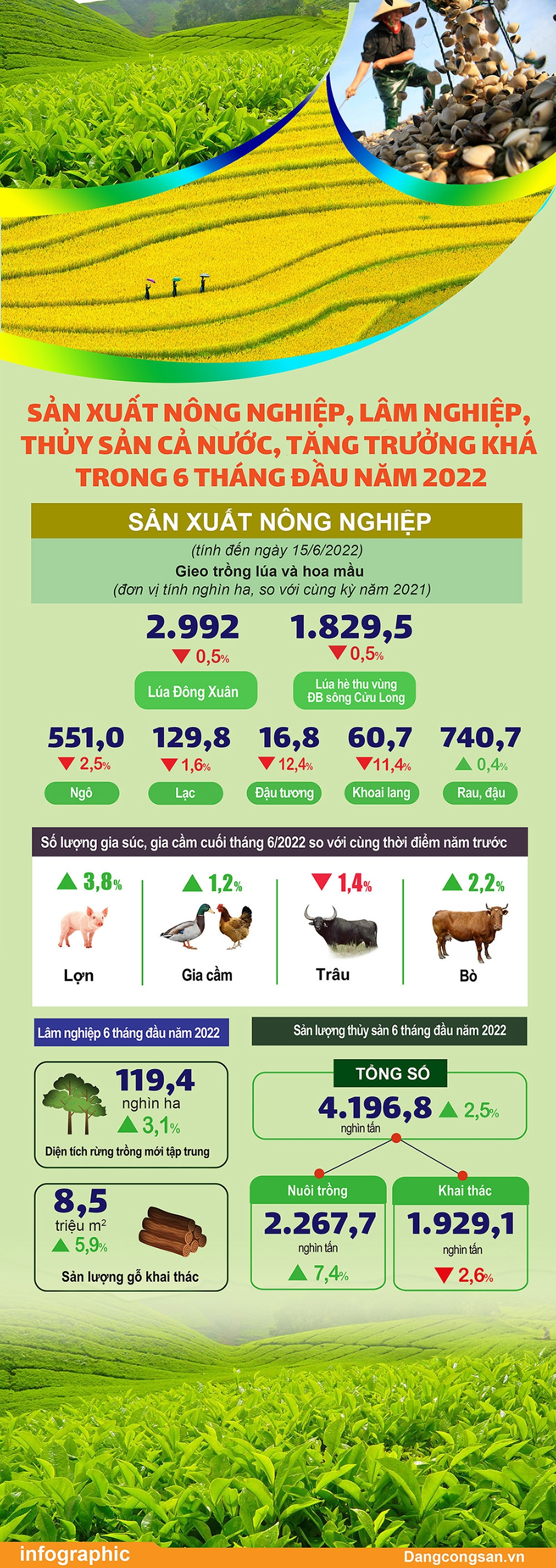Theo Tổng cục Thống kê, sản xuất nông nghiệp, lâm nghiệp, thủy sản cả nước, trong 6 tháng đầu năm 2022 giữ mức tăng khá trong bối cảnh giá cả vật tư tăng cao. Một số cây lâu năm tăng so với cùng kỳ năm 2021; chăn nuôi lợn và gia cầm phát triển ổn định; khai thác và tiêu thụ gỗ khởi sắc; nuôi trồng thủy sản tăng trưởng do nhu cầu tiêu dùng và giá xuất khẩu tăng.