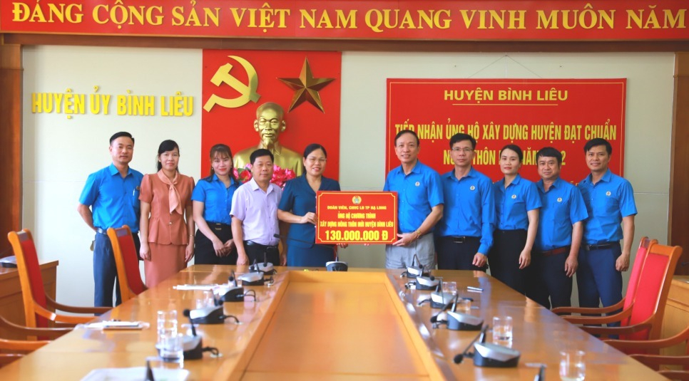 Lãnh đạo LĐLĐ TP Hạ Long cùng đại diện các công đoàn cơ sở trao hỗ trợ xây dựng NTM cho huyện Bình Liêu. Ảnh: Thanh Hằng.