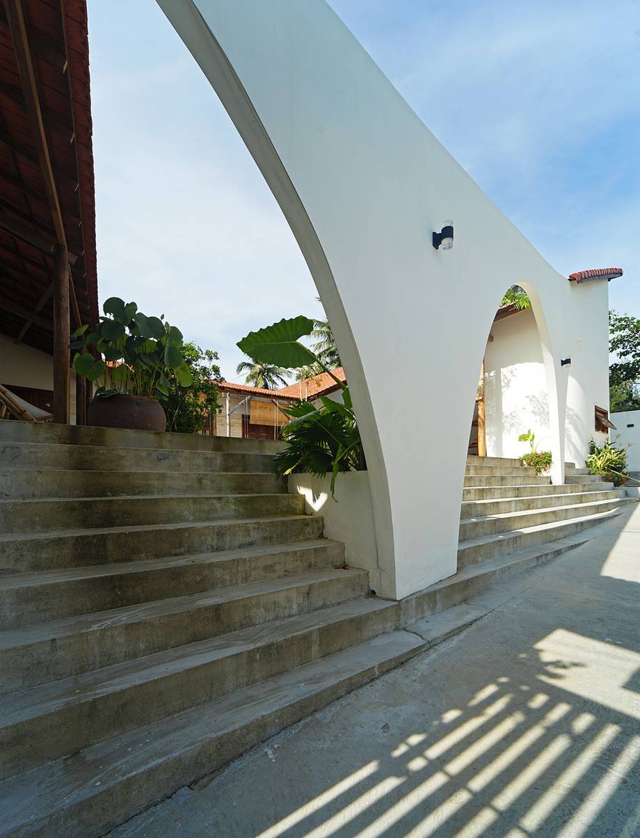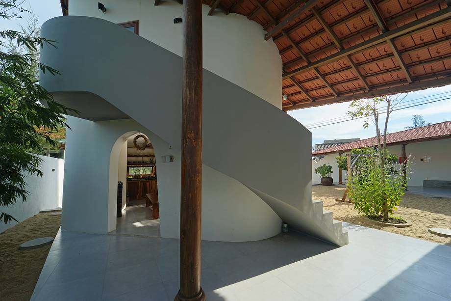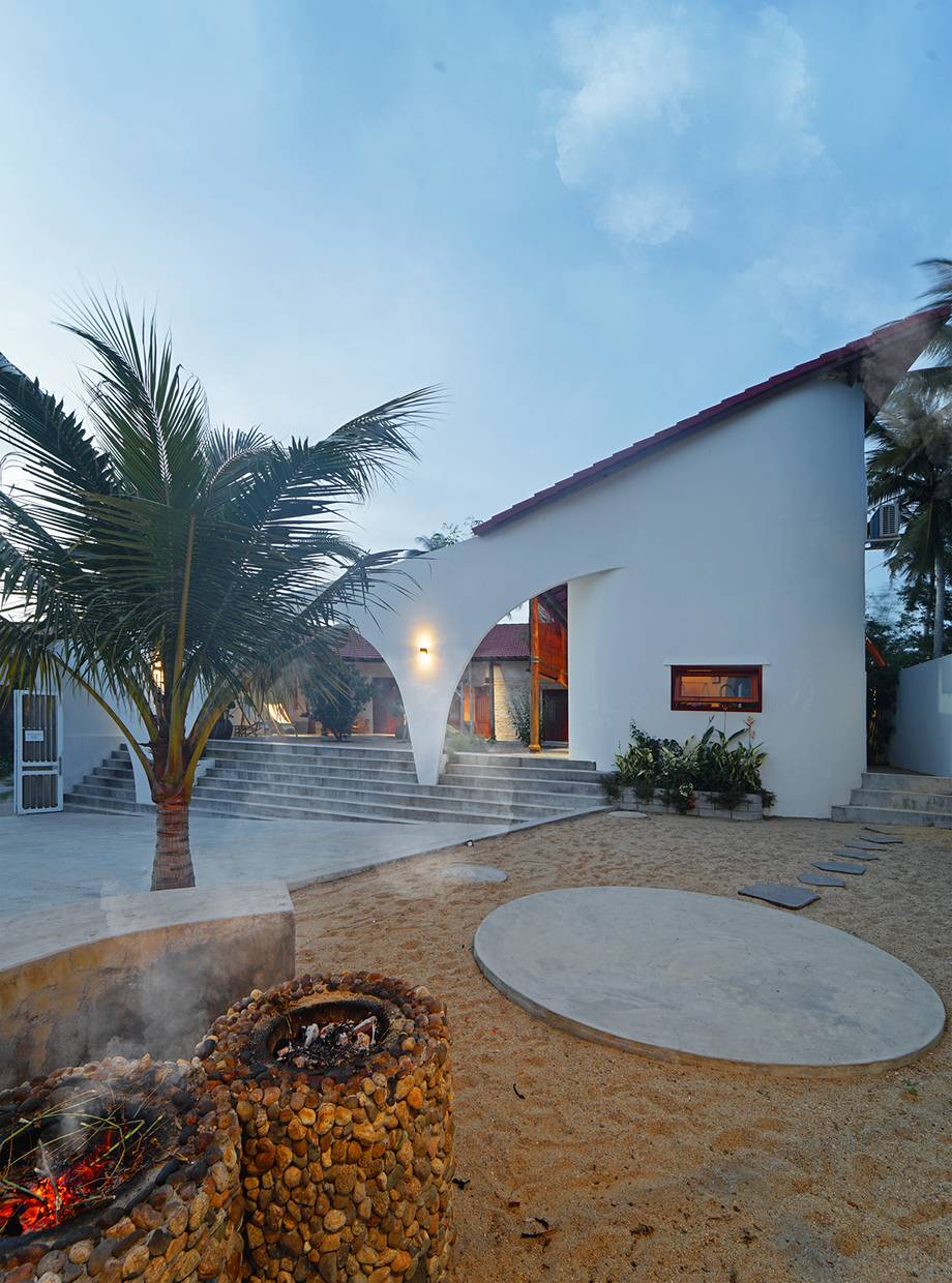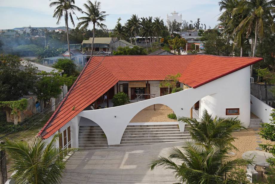 Thiết kế nâng cao giá trị về màu sắc, hình khối với màu đỏ của gạch ngói, màu vàng của nắng và cát. Mái ngói đỏ kết hợp với tường trắng uốn lượn, tạo cảm giác như hai tấm lụa trắng và đỏ quấn vào nhau.