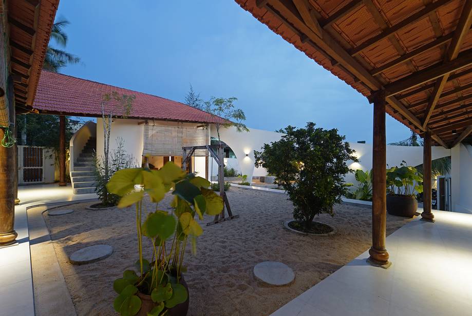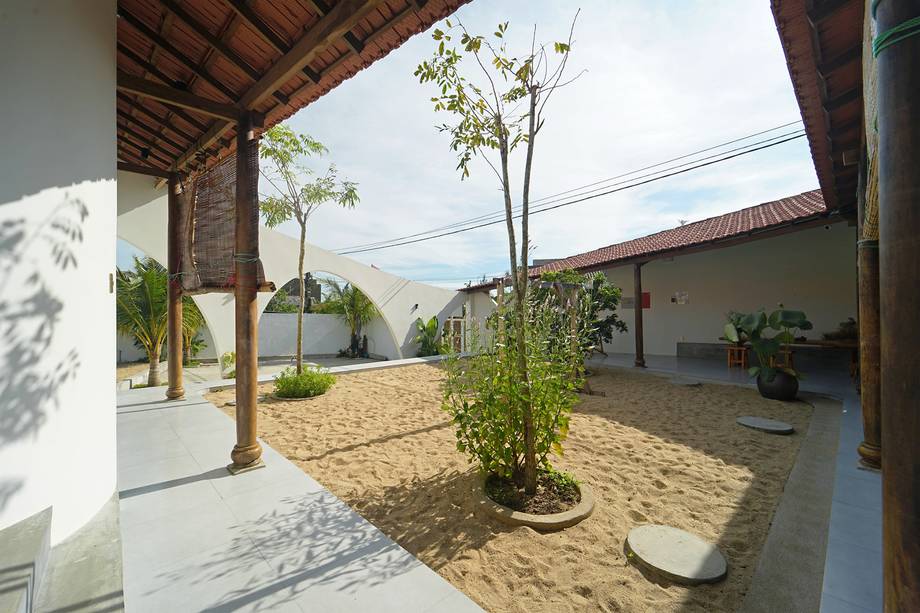 Thay vì bãi cỏ và nhiều cây xanh như nhiều công trình nghỉ dưỡng khác, một sân cát được đặt giữa các khu nhà.