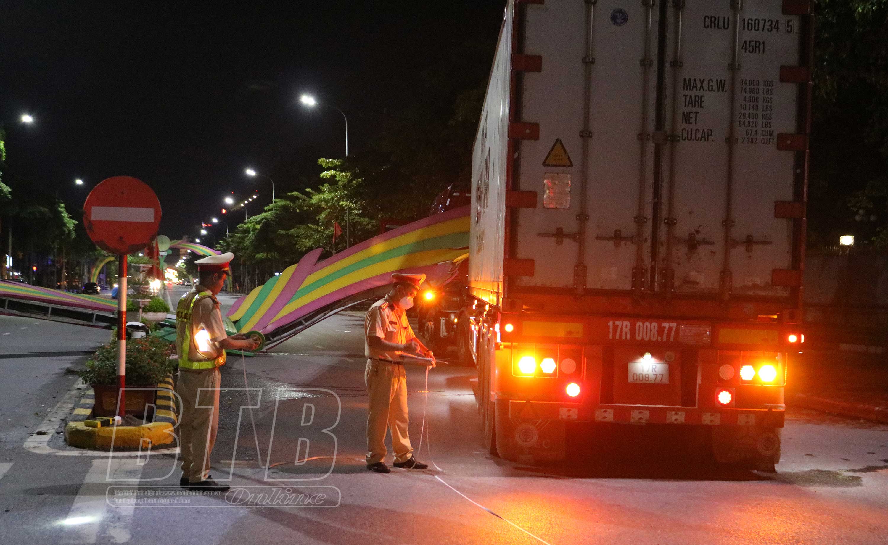 Vào khoảng 21 giờ 30 phút ngày 14/7, một xe container bất ngờ đâm đổ cổng chào trên đường Lê Lợi, thành phố Thái Bình.