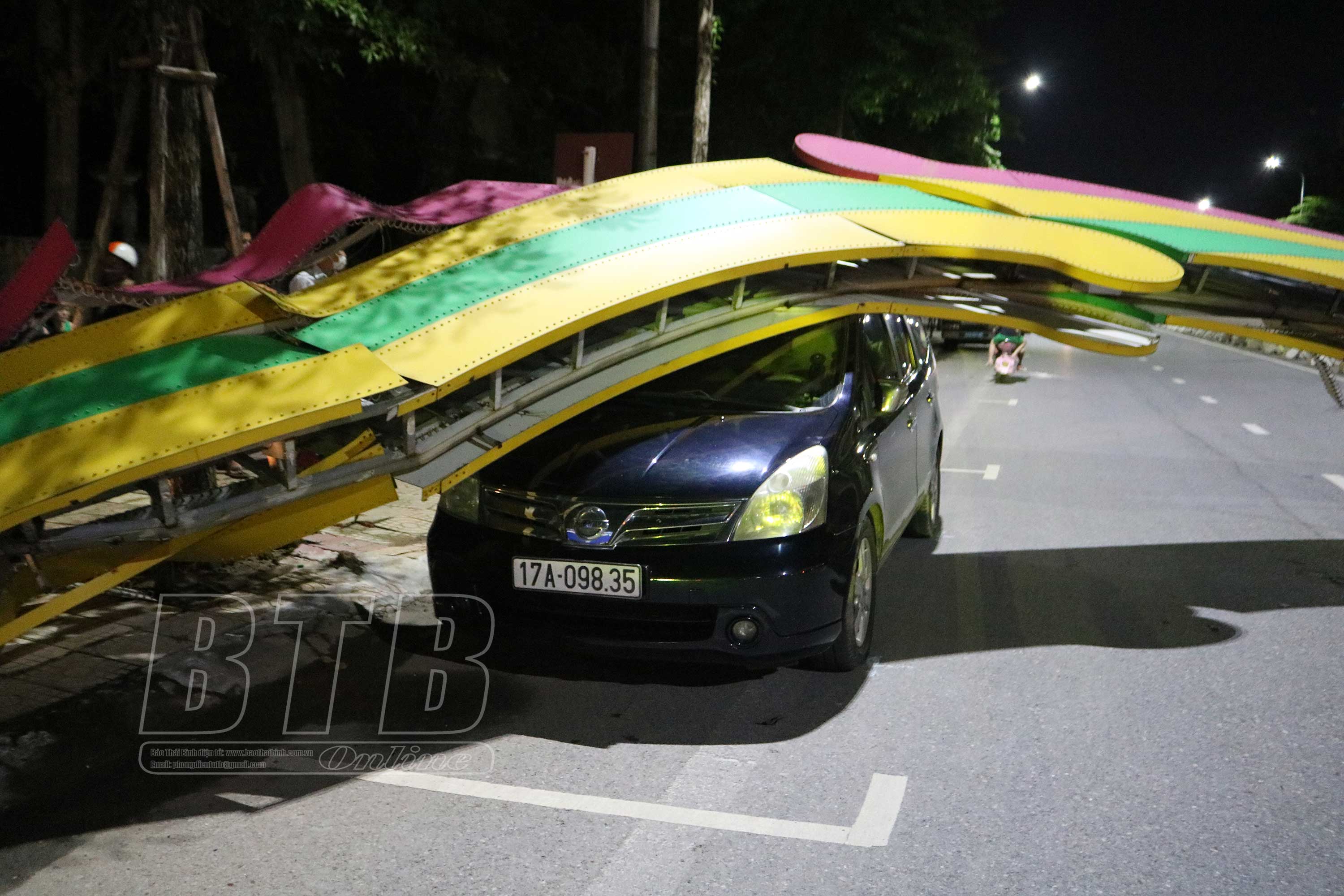 Xe ô tô mang biển kiểm soát 17A-098.35 đỗ ở chiều đường đối diện bị một phần cổng chào đè lên.