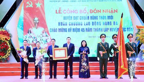 Tại buổi lễ, thừa ủy quyền của Chủ tịch nước, Phó Bí thư Thường trực Thành ủy Nguyễn Thị Tuyến đã trao Huân chương Lao động hạng Ba; trao Bằng công nhận huyện đạt chuẩn nông thôn mới năm 2020 của Thủ tướng Chính phủ cho cán bộ và nhân dân huyện Sóc Sơn.