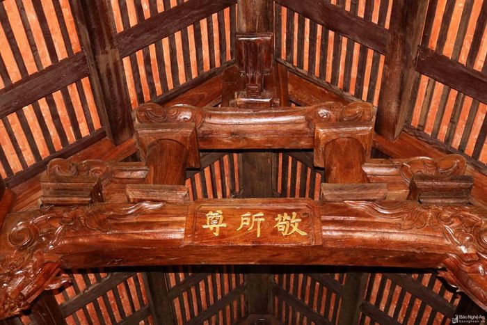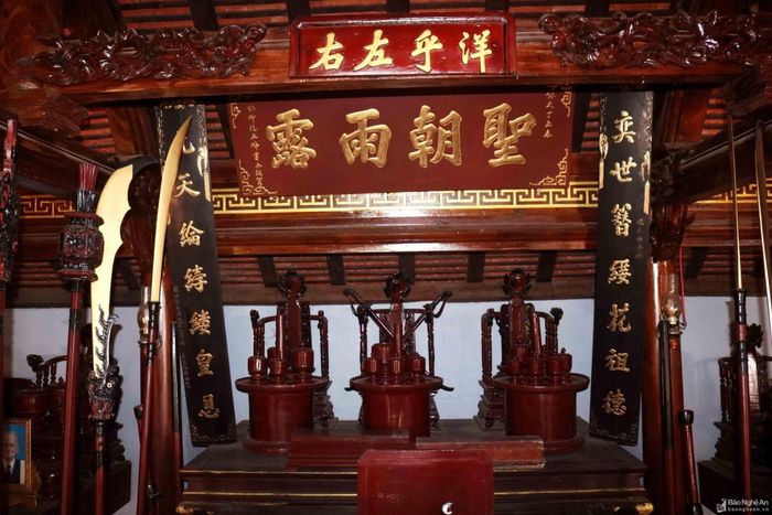 Tại nhà thờ còn lưu giữ được nhiều đồ tế khí cổ kính, như long ngai, cỗ bồng, gươm đao, đại tự, câu đối... Với những giá trị to lớn, nhà thờ đại tôn họ Bùi đã được công nhận là Di tích Lịch sử - Kiến trúc nghệ thuật cấp tỉnh. Ngày 24/6/2022 vừa qua, UBND xã Thanh Yên huyện Thanh Chương đã tổ chức lễ đón nhận bằng xếp hạng di tích Kiến trúc Nghệ thuật và Lịch sử cấp tỉnh Nhà thờ đại tôn họ Bùi. Trong ảnh: Gian giữa của thượng đường thờ 3 long ngai, phía trên có bức hoành phi sơn son thếp vàng, khắc 4 chữ Hán lớn: “Khánh triều vũ lỗ”.