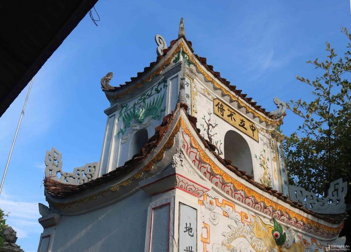 Tầng trên của nghi môn có 4 cửa vòm, trổ họa 2 mặt tùng, cúc, trúc, mai. Giữa lầu có bàn chơi cờ "vui tử". Hai mặt bên hình quyết trụ có câu đối: "Luân thường lương đóng dư/Tuấn dung long môn khoát" với ý nghĩa “Luân thường đạo lý nhà phượng bao la. Cưỡi ngựa vinh quy cửa rồng rộng mở”. Mặt ngoài nghi môn đắp nổi 4 chữ Hán lớn: “Trung lập bất ỷ” có nghĩa là hiên ngang giữa đất trời.