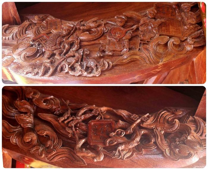 Các mảng chạm trên thượng đường, đặc biệt là các kẻ trước phản ánh nhiều đề tài truyền thống, các điển tích dân gian (Tô Vũ đi chăn dê; Ngư ông Lã Vọng; Cá chép hóa rồng; Trúc hóa rồng) và các sinh hoạt dân gian trong đời sống thường ngày (uống rượu, đánh cờ, chơi đàn, đọc sách...).