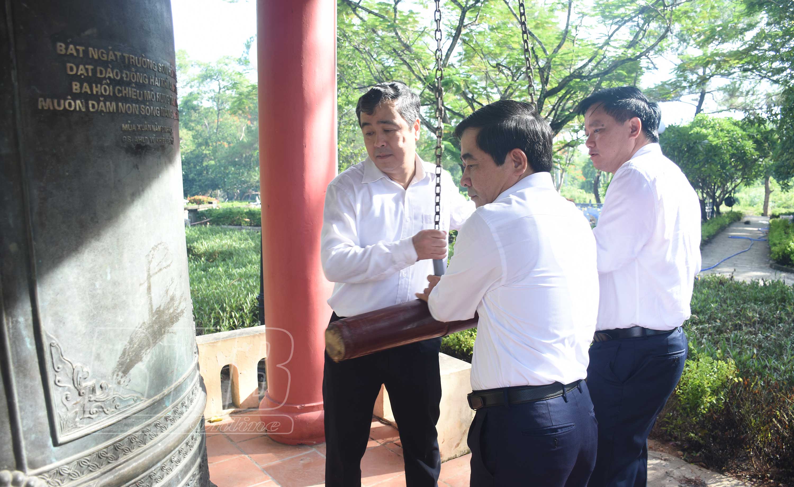 Các đồng chí lãnh đạo tỉnh thực hiện nghi thức thỉnh chuông tại Nghĩa trang Liệt sĩ quốc gia Trường Sơn.