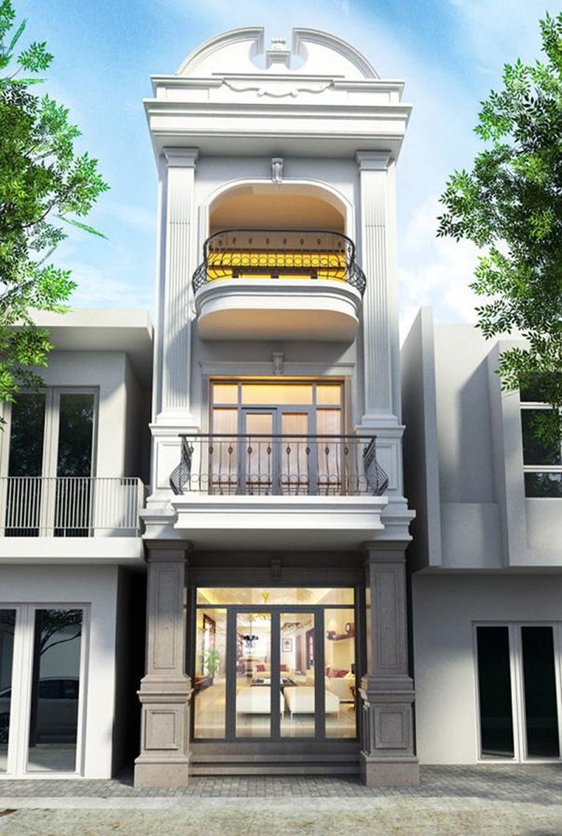Mẫu nhà ống tân cổ điển 3 tầng đơn giản nhưng vẫn cuốn hút nhờ điểm nhấn là lan can ban công ấn tượng. Ảnh minh hoạ)