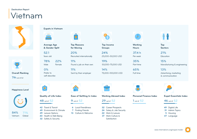 Kết quả khảo sát Expat Insider cho thấy Việt Nam đứng thứ 7 trong số 52 quốc gia và vùng lãnh thổ là điểm đến tốt nhất cho người nước ngoài. (Nguồn: InterNations)