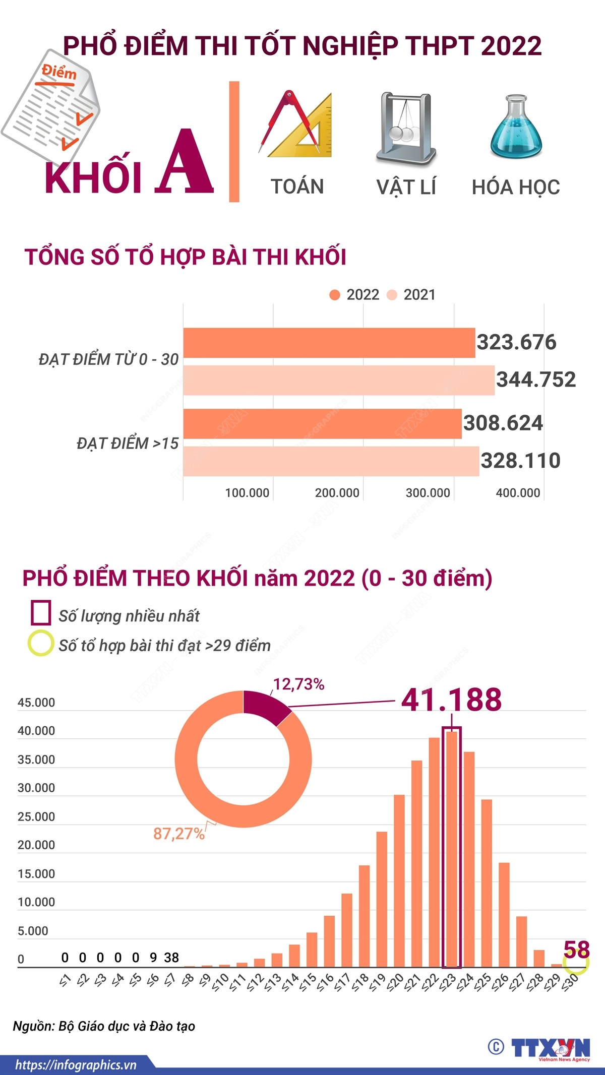 Ngày 24/7/2022, cùng với việc công bố phổ điểm các môn thi của Kỳ thi tốt nghiệp THPT năm 2022, Bộ Giáo dục và Đào tạo đã công bố kết quả phân tích phổ điểm của một số khối thi. Theo đó, ở khối A, số thí sinh đạt điểm từ trên 22 đến 23 điểm là nhiều nhất.