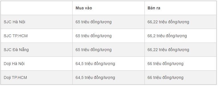 SJC Hà Nội: 64,7 triệu đồng/lượng (mua vào) - 66,22 triệu đồng/lượng (bán ra)