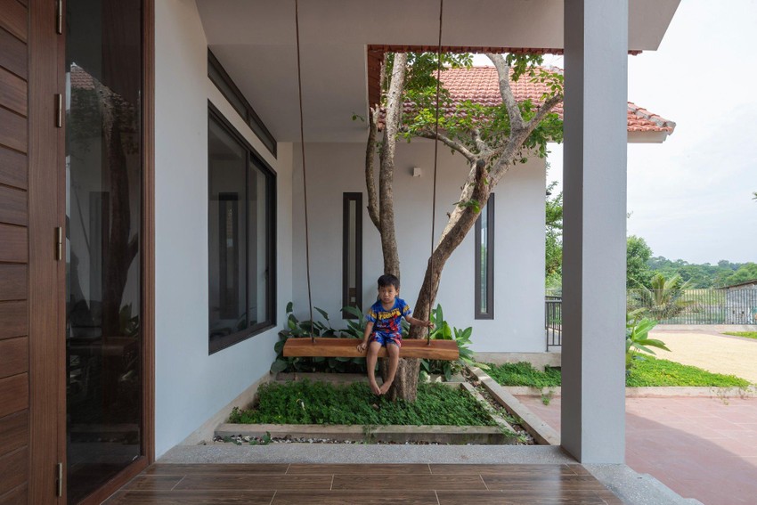 Những vật liệu như mái ngói, gạch đỏ lát sân tạo nét gần gũi, truyền thống cho ngôi nhà mái ngói.