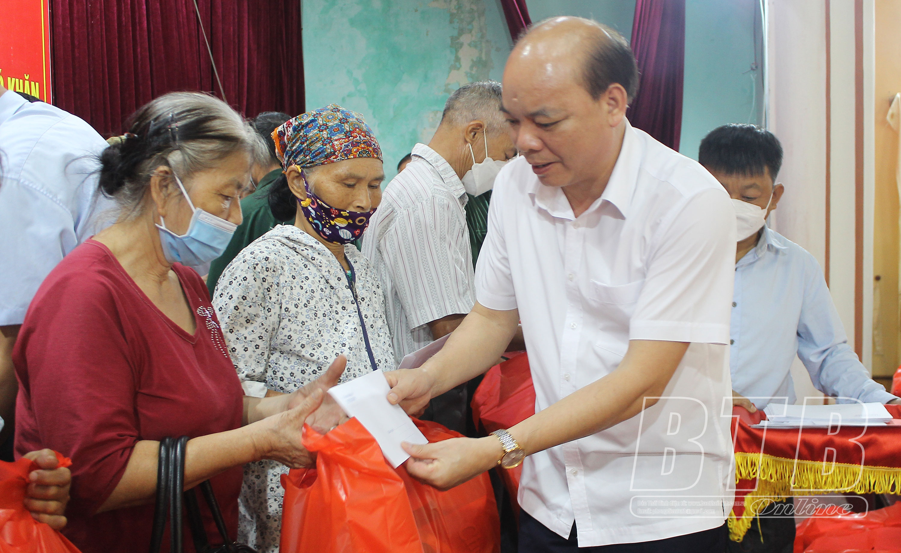 Đồng chí Đặng Thanh Giang, Ủy viên Ban Thường vụ Tỉnh ủy, Phó Chủ tịch thường trực HĐND tỉnh và các đồng chí lãnh đạo UBND huyện, Hội Nạn nhân chất độc da cam/đioxin huyện Vũ Thư trao quà cho nạn nhân chất độc da cam.