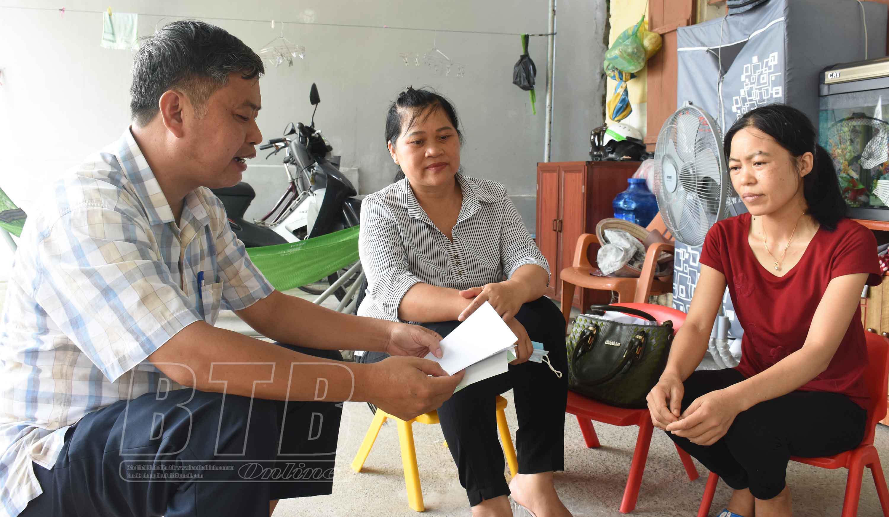 Cán bộ BHXH huyện Tiền Hải tuyên truyền về chính sách ưu việt của BHXH tự nguyện cho người dân trên địa bàn thị trấn.