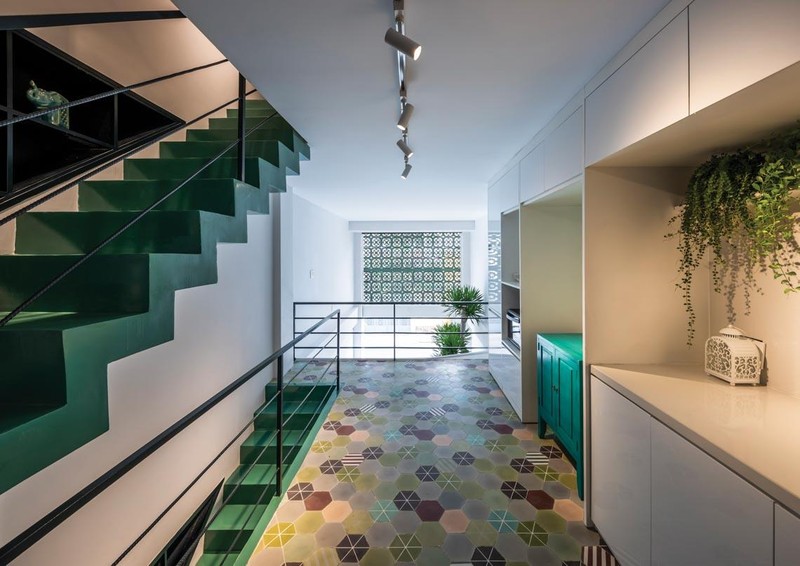 Ngôi nhà phố có bề ngang chỉ 3m. Tuy nhiên, kiến trúc sư đã tạo ra mặt tiền đẹp và nổi bật với lớp gạch bông cản nắng, lưu thông gió màu xanh lá cây. Lớp cửa sổ lá sách ở tầng 3 và 4 tạo vẻ cổ điển, mộc mạc.