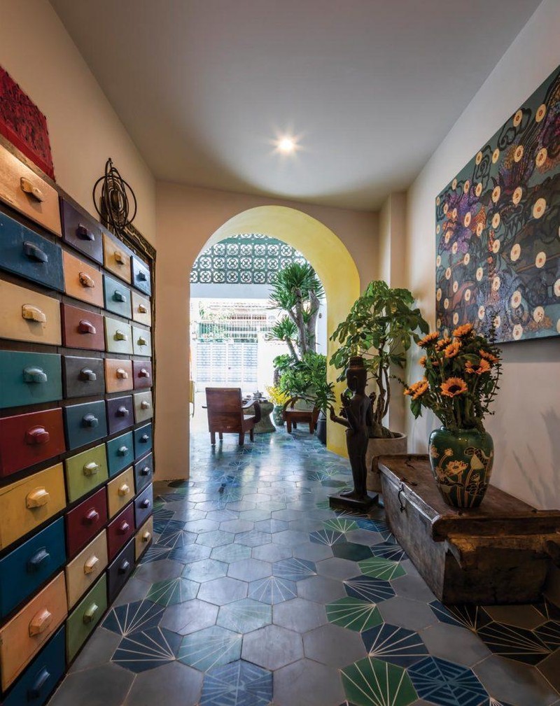 Trước khi bước vào phòng khách là khoảng đệm nhỏ, lọc bụi, cản hơi nóng để không gian bên trong mát mẻ hơn. Gia chủ là Phật tử nên từng đường nét thiết kế thể hiện rõ quan điểm và triết lý sống - đầy tĩnh tại, an yên. Màu sắc sử dụng vàng và xanh lá đan xen góp phần tô điểm cho công trình.
