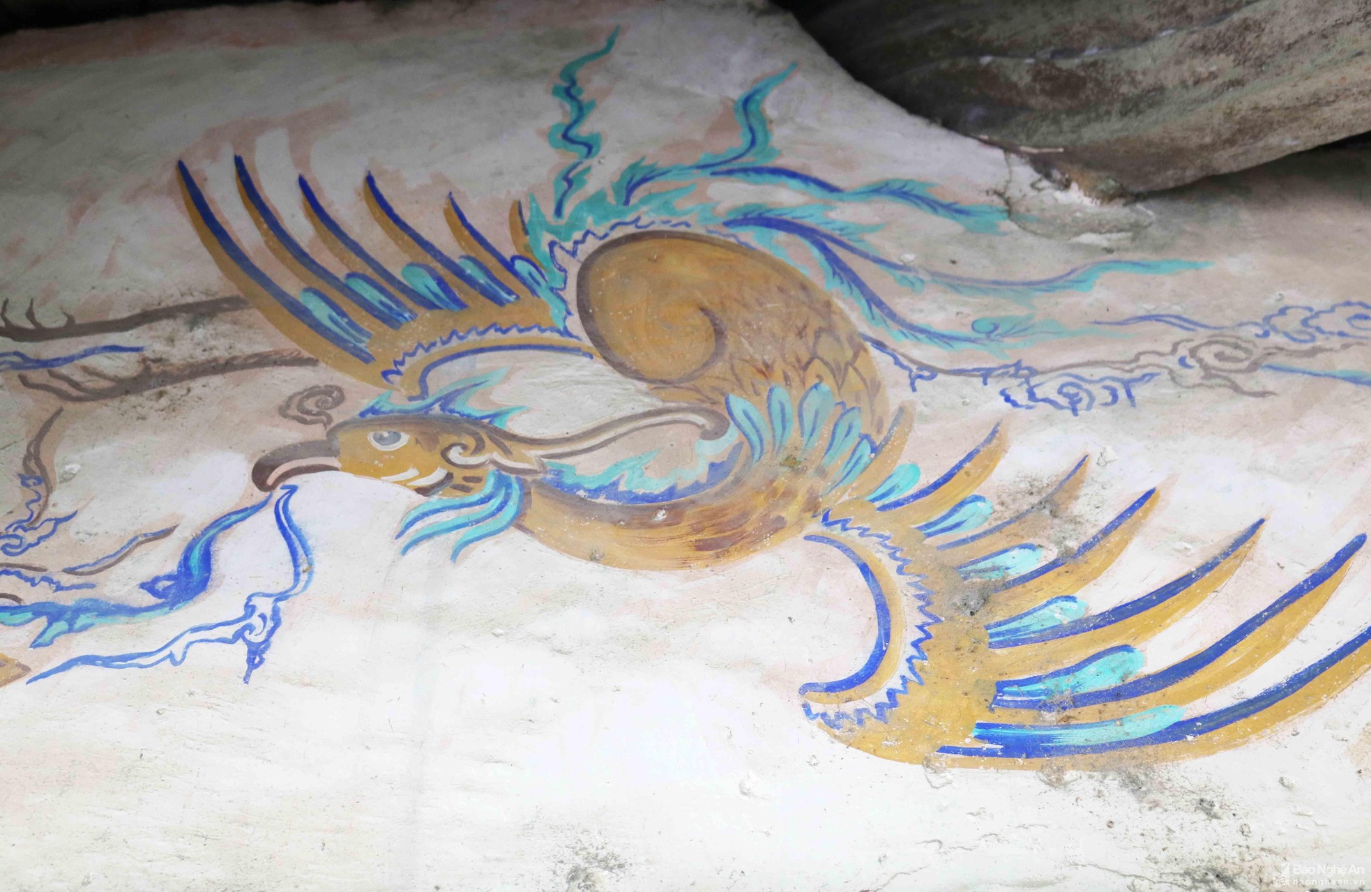Trên những bức tường của hạ đình còn được đắp nổi phù điêu hình ảnh ngựa, tướng canh, cuốn thư... Ngoài ra còn có những bức vẽ hình rồng, phượng... sống động, uyển chuyển. Trong ảnh: Bức vẽ chim phượng cổ xưa trên mặt trước đình Tám Mái.