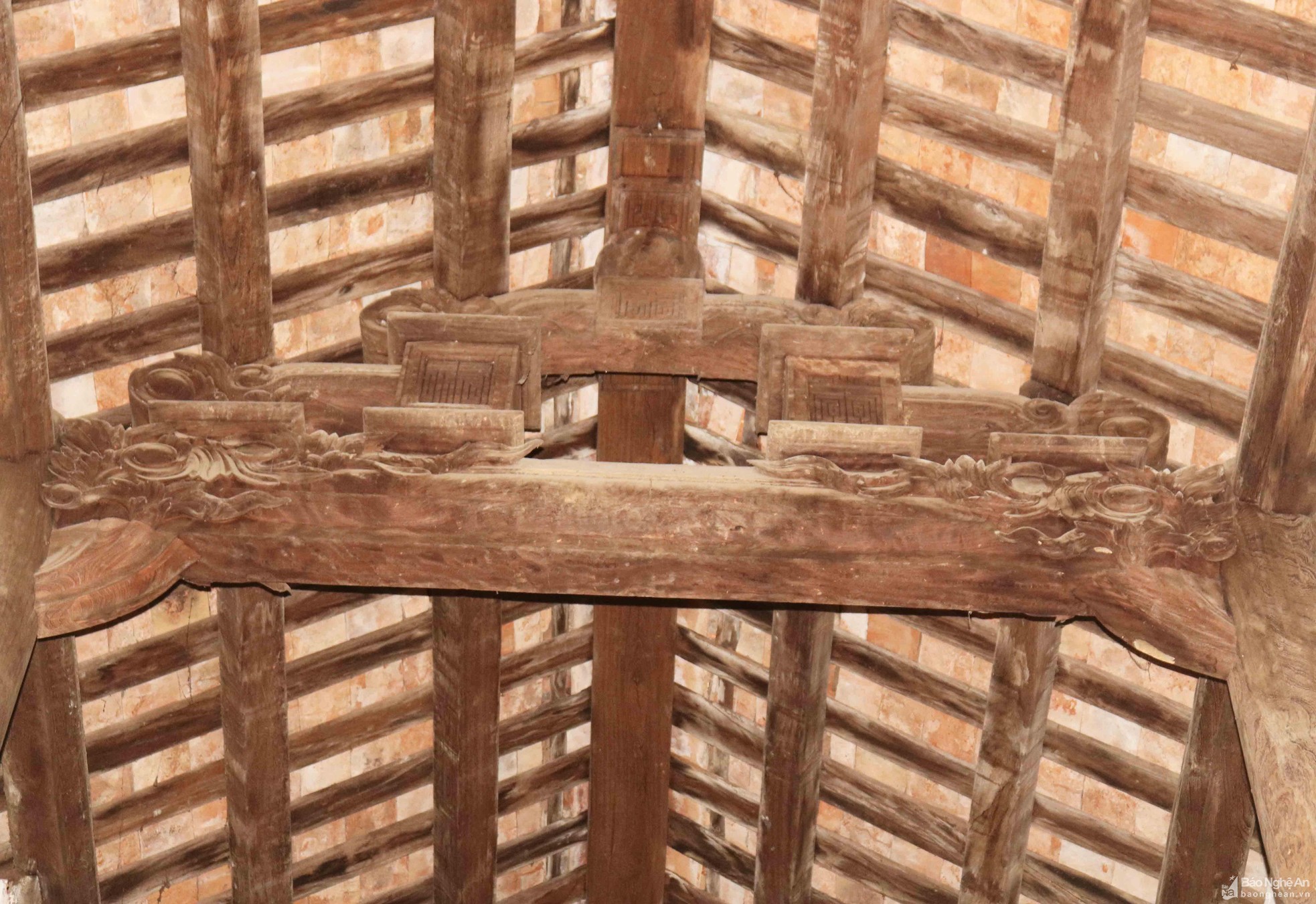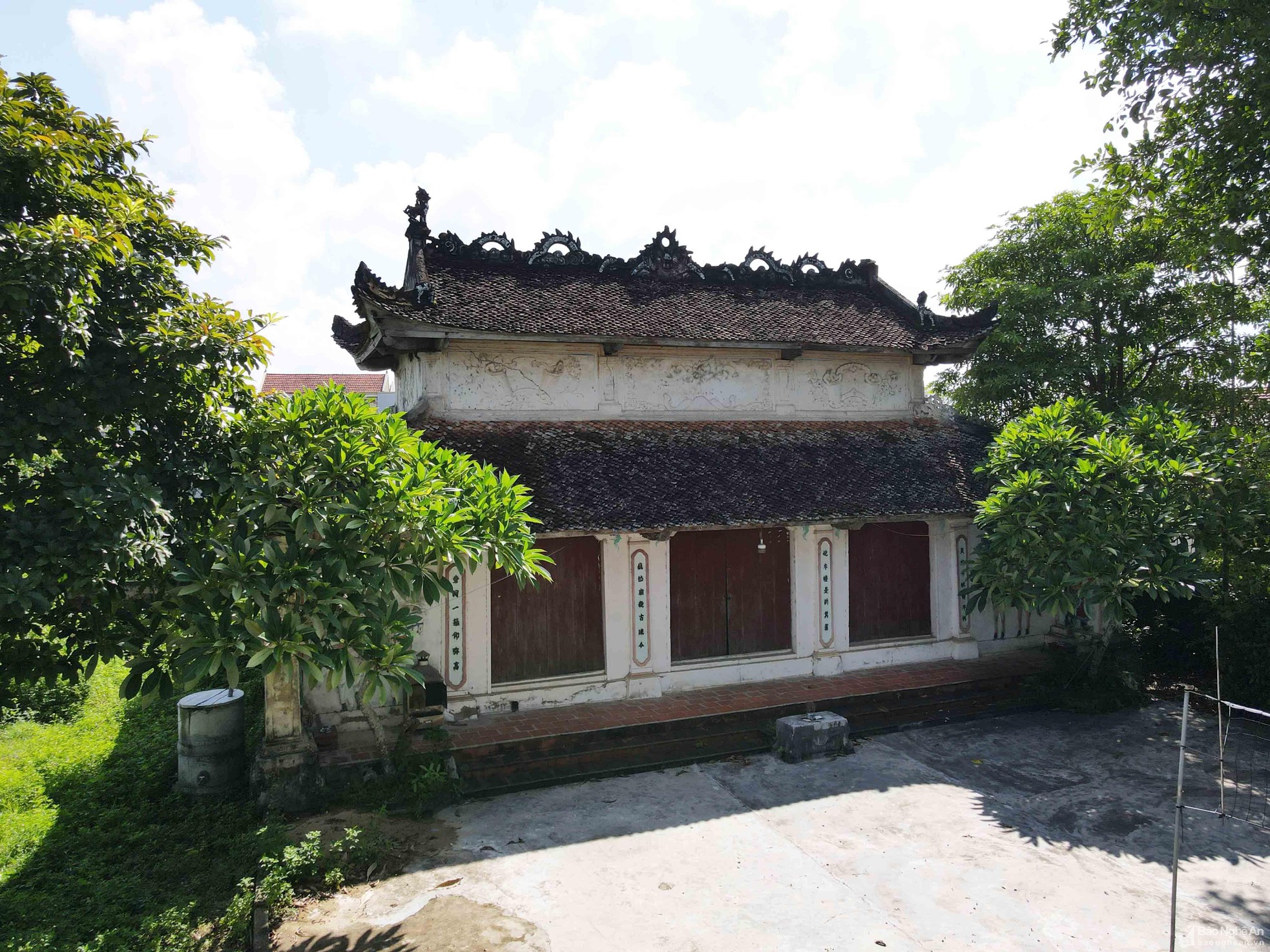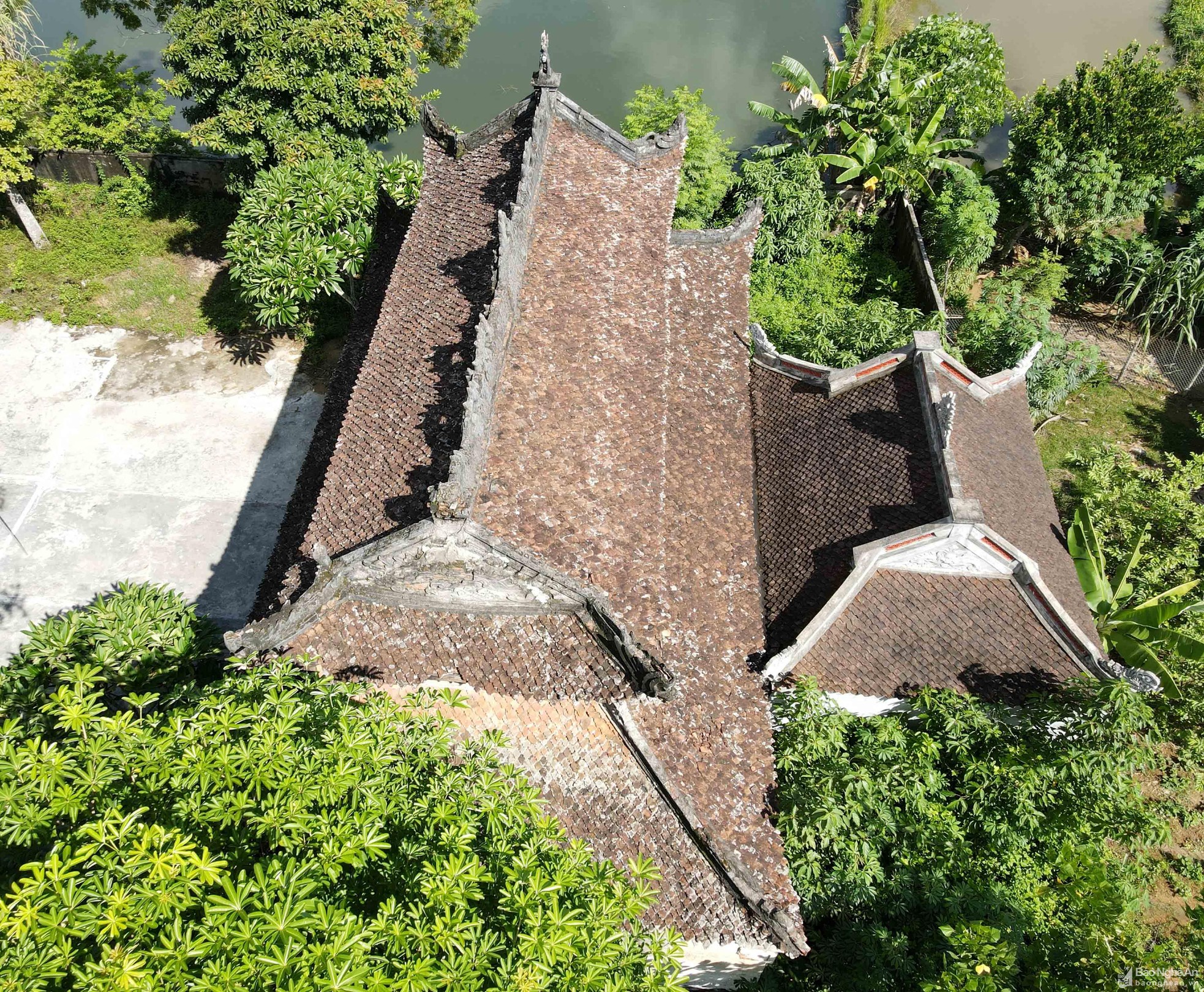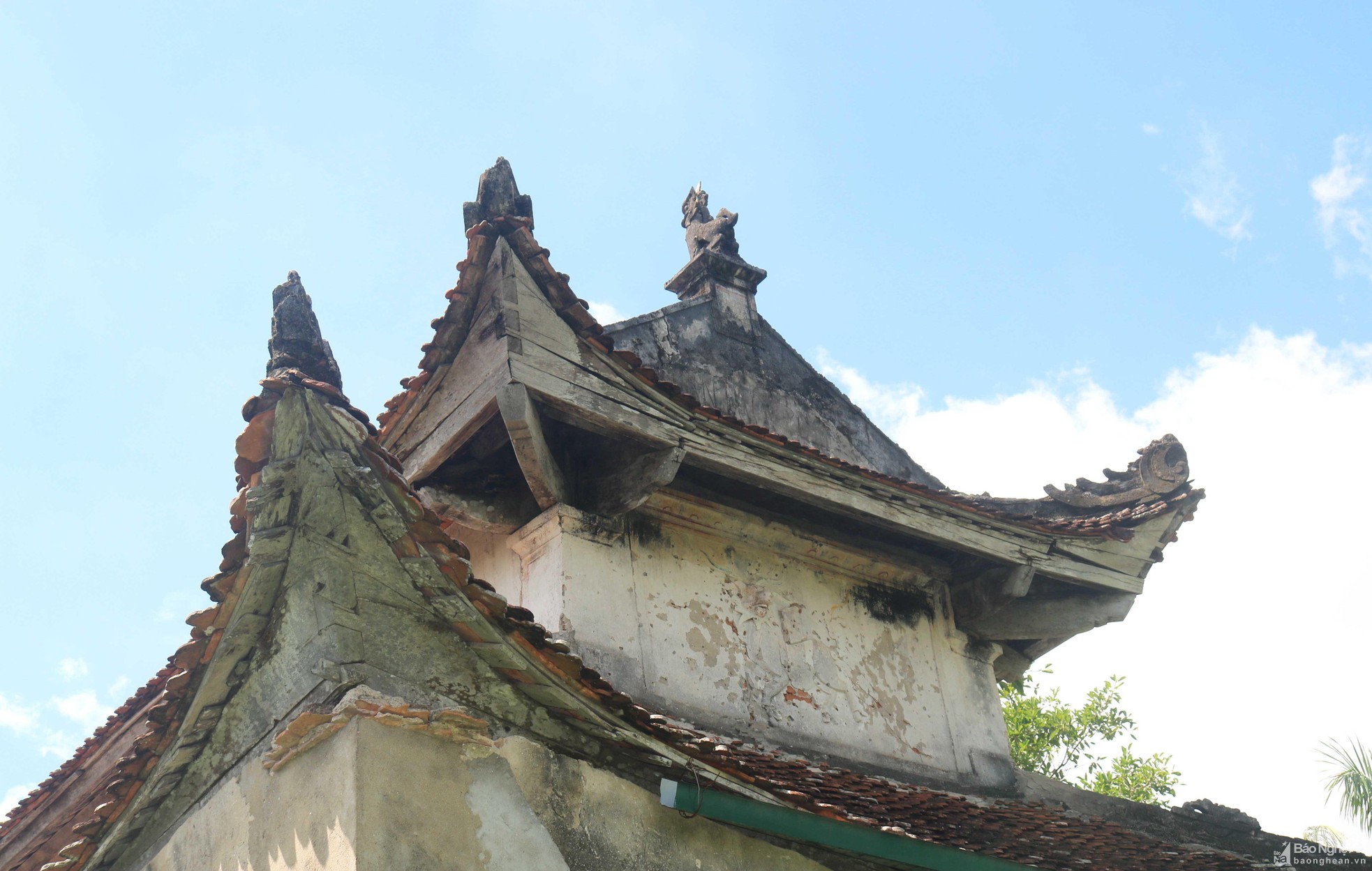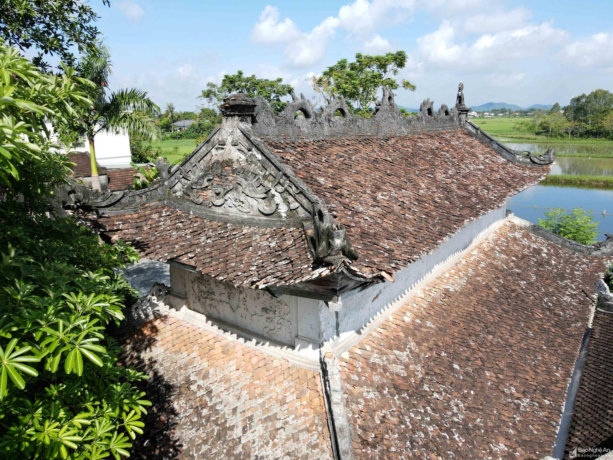 Trên các mái ngói, đặc biệt là trên các bờ dải tầng lầu có đắp hình lưỡng long triều nguyệt, 2 đầu nóc có 2 con nghê chầu vào giữa... trông rất cổ kính và uy nghi.