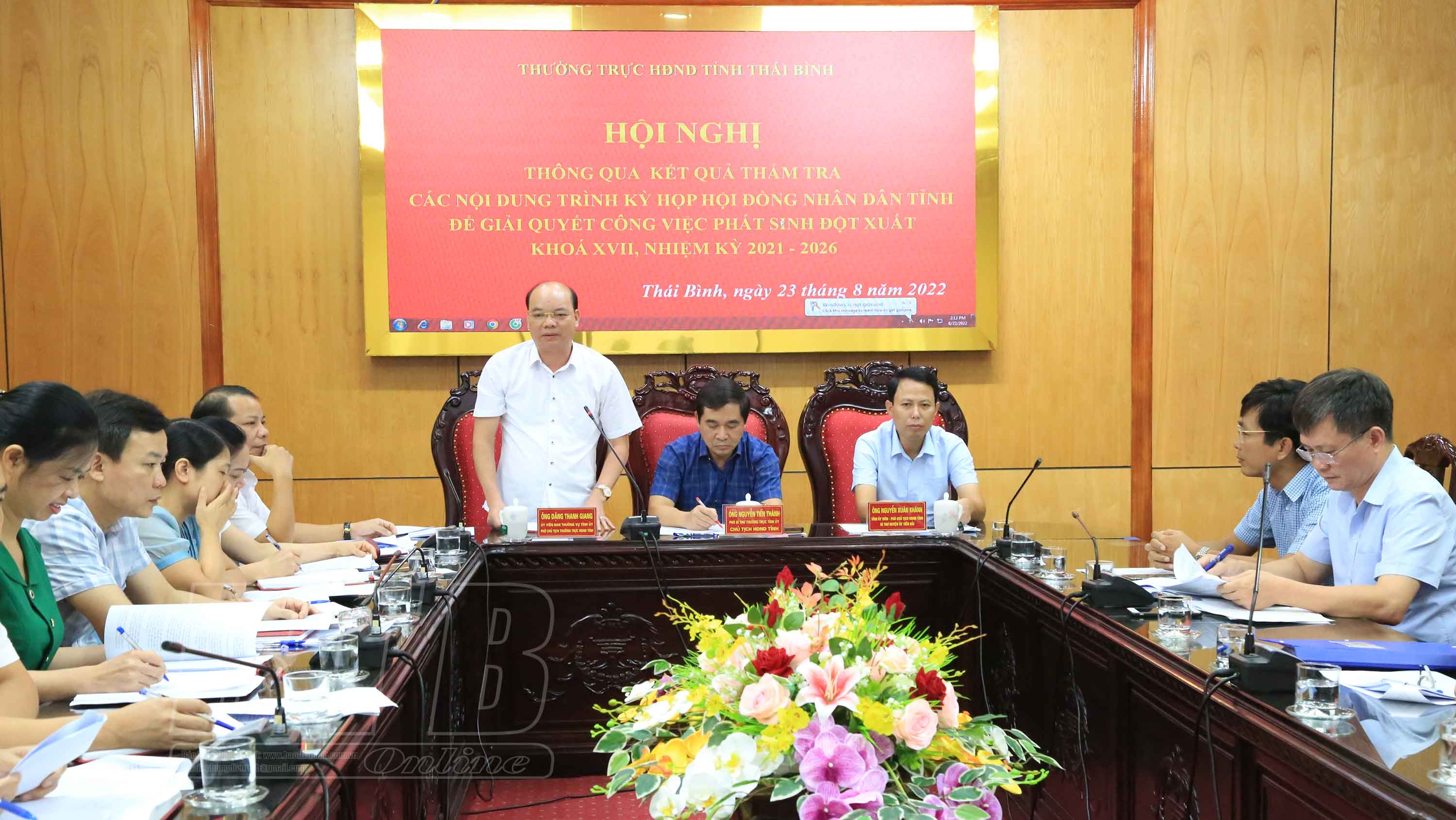 Chiều ngày 23/8, các đồng chí: Nguyễn Tiến Thành, Phó Bí thư thường trực Tỉnh ủy, Chủ tịch HĐND tỉnh; Đặng Thanh Giang, Ủy viên Ban Thường vụ Tỉnh ủy, Phó Chủ tịch thường trực HĐND tỉnh; Nguyễn Xuân Khánh, Tỉnh ủy viên, Phó Chủ tịch HĐND tỉnh dự và chủ trì hội nghị Thường trực HĐND tỉnh nghe và cho ý kiến về kết quả thẩm tra nội dung các tờ trình, dự thảo nghị quyết trình kỳ họp HĐND tỉnh để giải quyết công việc phát sinh đột xuất.