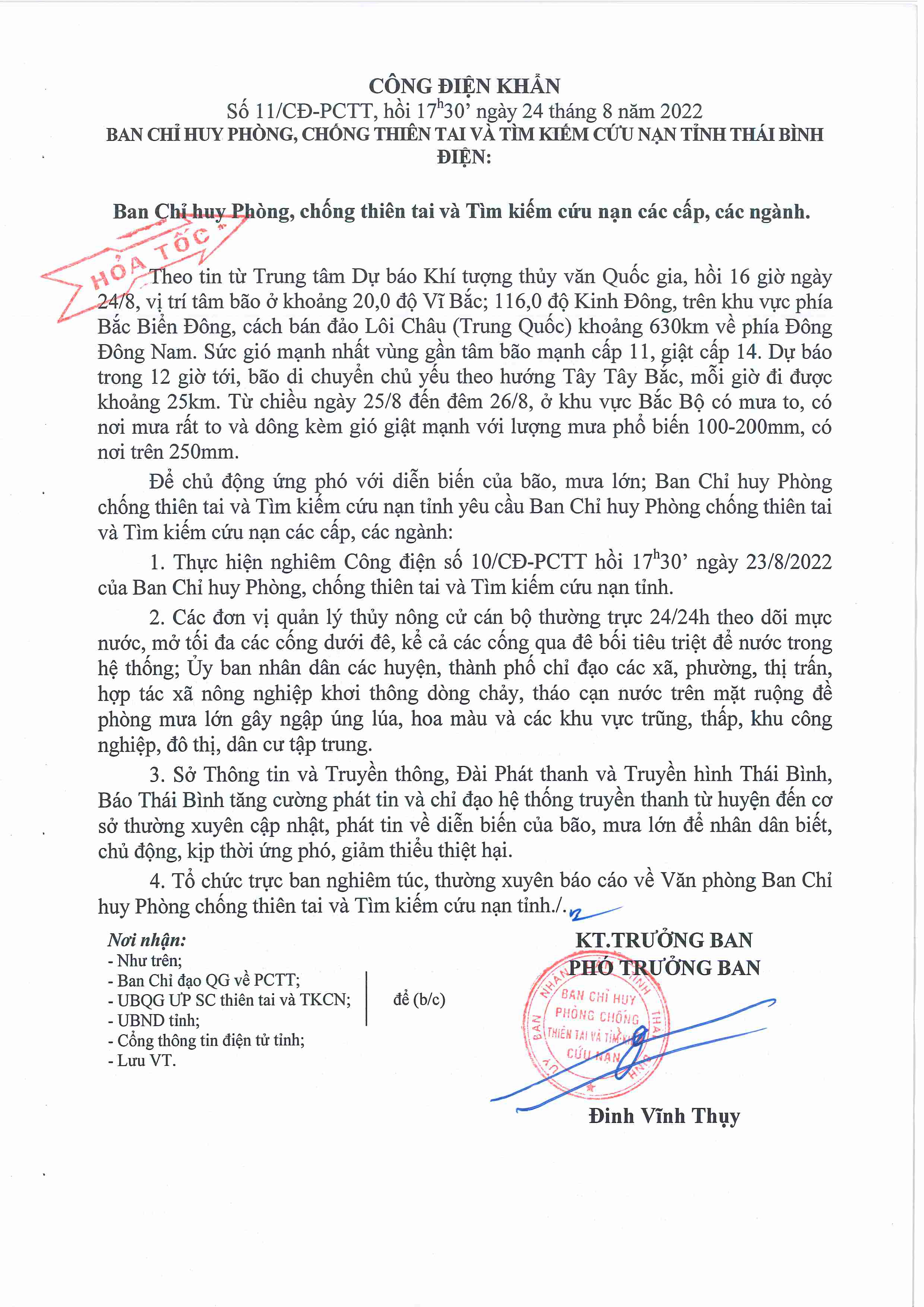Công điện khẩn số 11/CĐ-PCTT của Ban Chỉ huy PCTT và TKCN tỉnh Thái Bình
