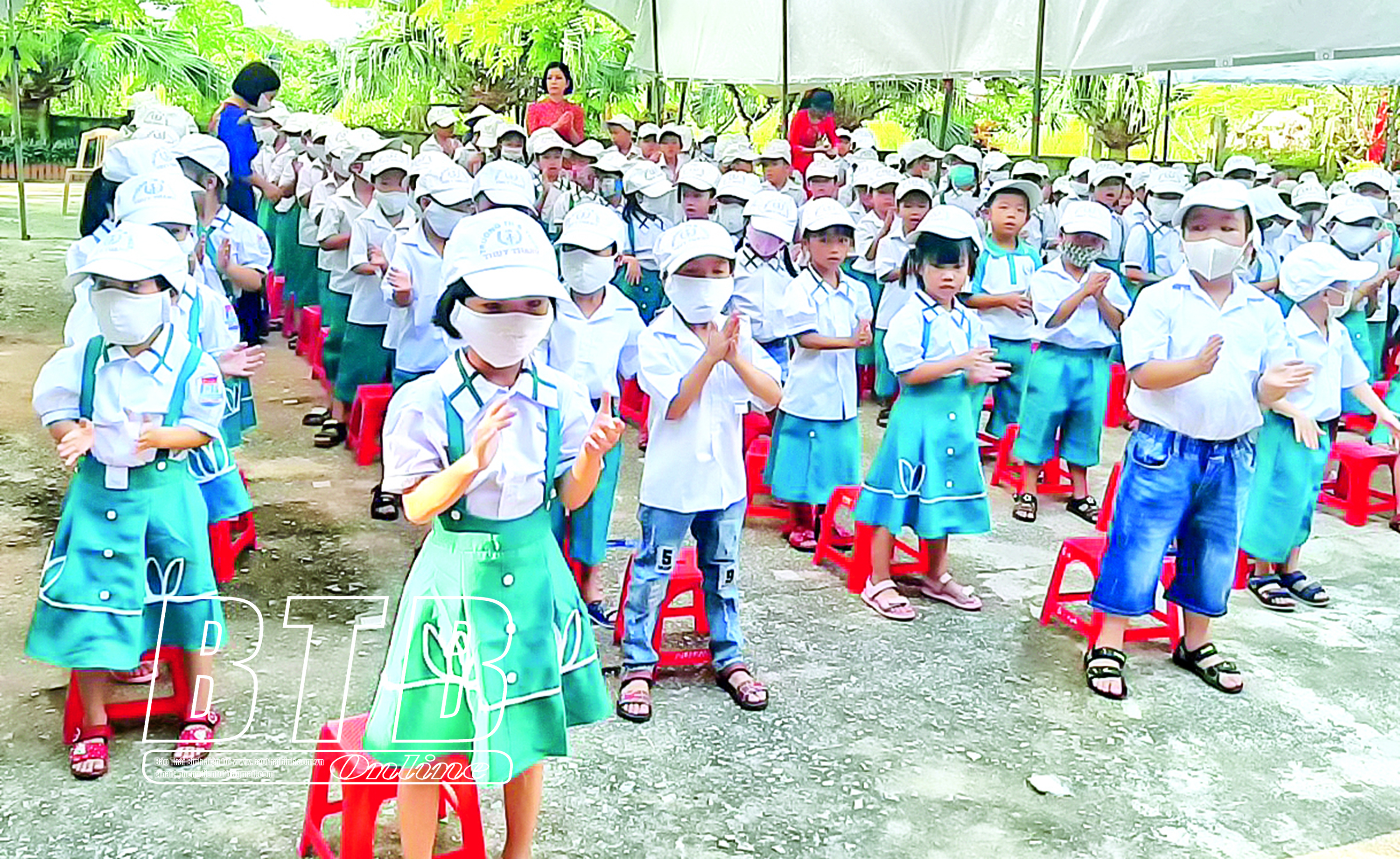 Học sinh Trường Tiểu học và THCS Thụy Thanh (Thái Thụy) chào đón năm học mới.