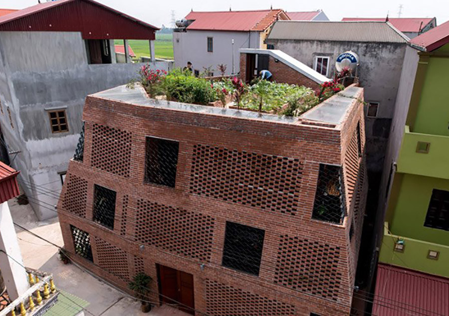 9. Nhà “Hang gạch” tại TP.Hà Nội: Thiết kế hai lớp gạch đục lỗ bao quanh ngôi nhà tại TP.Hà Nội này mang đến cho những người cư ngụ trong đó cảm giác như đang sống giữa thiên nhiên. Theo kiến trúc sư, ngôi nhà trông giống như hang động. Nó được bao bọc bởi hai lớp tường gạch gặp nhau ở các góc dốc. Nằm rải rác là những khe hở lớn nhỏ, giúp cho ánh sáng và gió đi xuyên vào nhà. Hai lớp gạch này còn hoạt động như một bộ lọc để ngăn ánh sáng chiếu trực tiếp, khói bụi và tiếng ồn từ bên ngoài môi trường vào nhà.