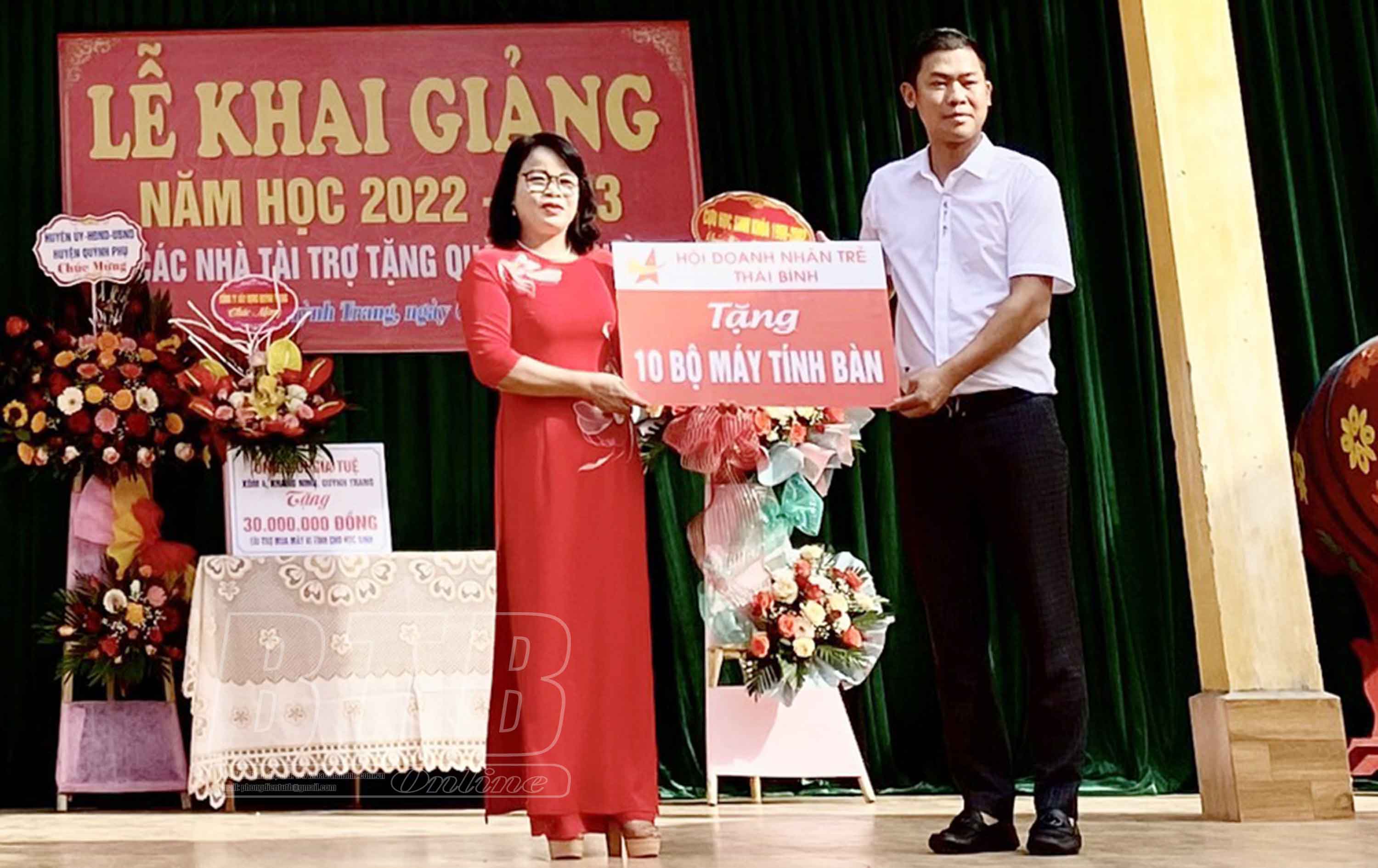 Cùng trong dịp này, Hội Doanh nhân trẻ tỉnh đã vận động hội viên ủng hộ, trao tặng 10 bộ máy tính cho thày trò Trường Tiểu học và Trung học cơ sở xã Quỳnh Trang, huyện Quỳnh Phụ phục vụ công tác dạy và học trong năm học mới. Đây cũng là những hoạt động thiết thực các doanh nhân trẻ hưởng ứng phong trào thi đua sản xuất, kinh doanh giỏi, tích cực thực hiện các hoạt động thiện nguyện, an sinh xã hội chào mừng Đại hội Hội Doanh nhân trẻ tỉnh Thái Bình lần thứ IV, nhiệm kỳ 2022-2027.