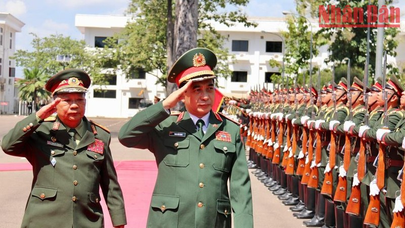 Đại tướng Chansamone Chanyalath dành sự đón tiếp trọng thị với nghi thức cao nhất của quân đội dành cho Đại tướng Phan Văn Giang và Đoàn đại biểu quân sự cấp cao Việt Nam. (Ảnh: Trịnh Dũng).