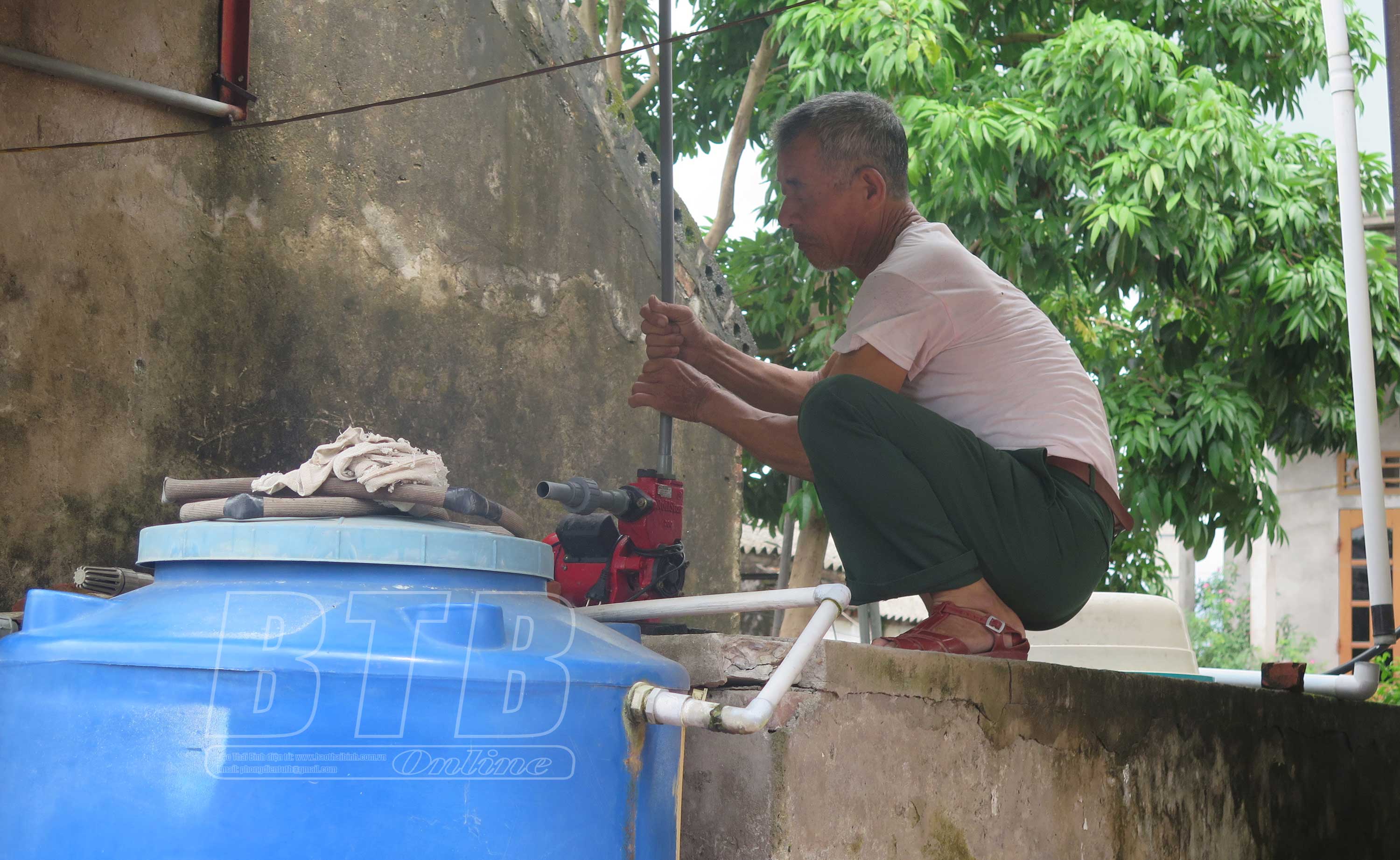 Tới nhà ông Nguyễn Viết Lanh, thôn An Chỉ chúng tôi được chứng kiến, mặc dù đã 77 tuổi song ông vẫn phải hứng từng giọt nước mưa để dùng. Ông Lanh bức xúc: Cả tháng qua nhà tôi không có nước sạch, các tháng trước cũng thiếu nước thường xuyên. Các bể chứa nước sạch luôn trong tình trạng cạn khô nhiều ngày nên tôi phải xin nước giếng khoan của hàng xóm để dùng. Tuy nhiên, tuổi cao sức yếu không xin được mãi tôi buộc phải quay lại thời các cụ ngày xưa đó là dùng nilon quấn thân cây cau để lấy nước chảy xuống bể mỗi khi trời mưa. Cùng với đó là lấy tất cả các loại xô, chậu để hứng nước mưa trên mái nhà sau đó ròng dây hút xuống bể dưới. Cuộc sống thiếu nước sinh hoạt khiến chúng tôi vô cùng cực khổ. Những ngày nắng nóng vừa qua vợ chồng tôi thay phiên nhau hai ngày tắm một lần, ngoài ra còn phải tiết kiệm bằng cách dùng nước rửa rau để rửa lại bát và rửa chân tay.