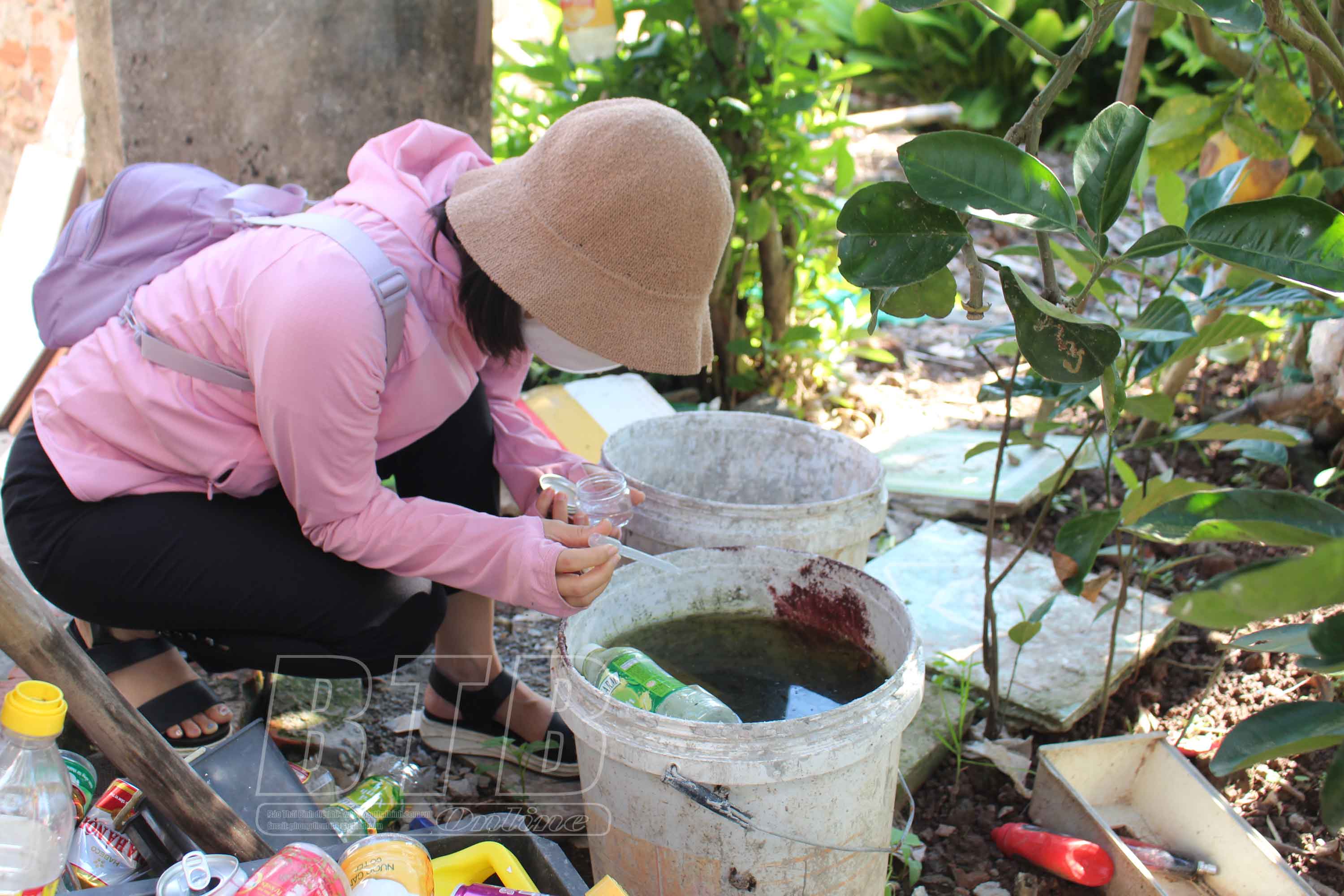 Cán bộ Trung tâm Kiểm soát bệnh tật tỉnh giám sát chỉ số côn trùng, bọ gậy tại cộng đồng.